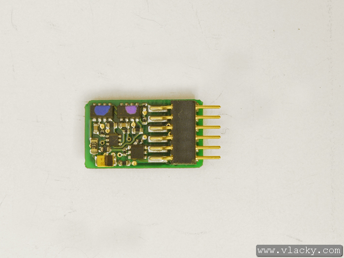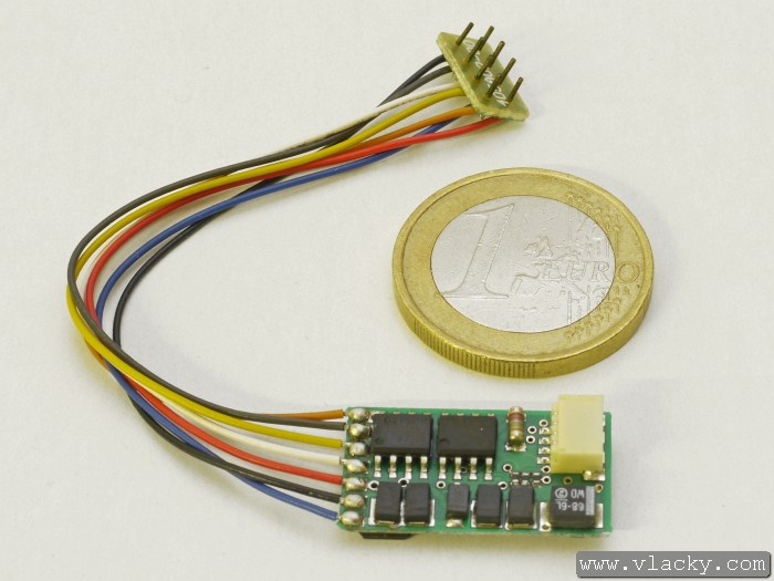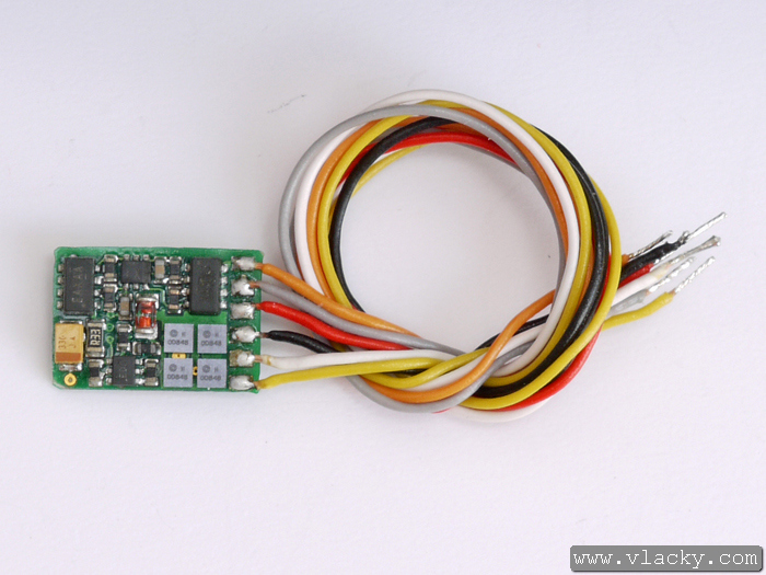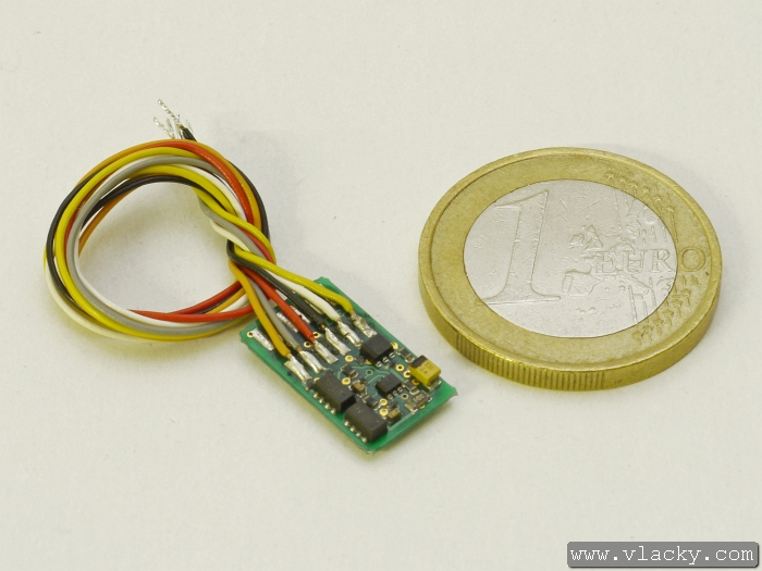 Malý lokomotivní dekodér s rozhraním dle normy NEM 651 s drátovými přívody. Lze jej tedy použít při