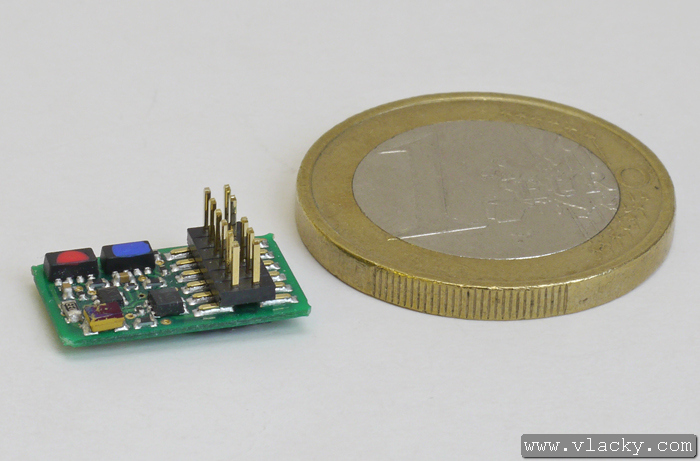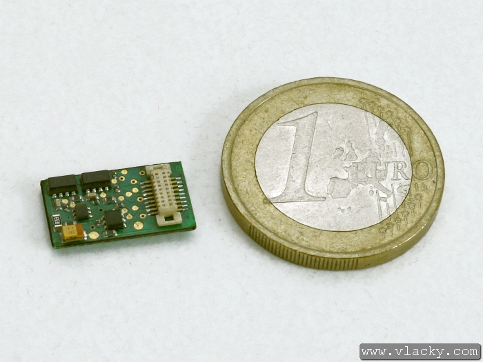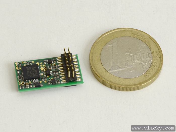 novějším konektorem PluX12 dle normy NEM 658. Tento lokomotivní dekodér lze většinou osadit