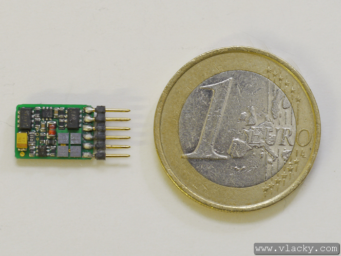 dekodérů. Trvalý proud motorku je 0,75A se špičkovou hodnotou 1A. Lokomotivní dekodér má 6 funkčních výstupů a