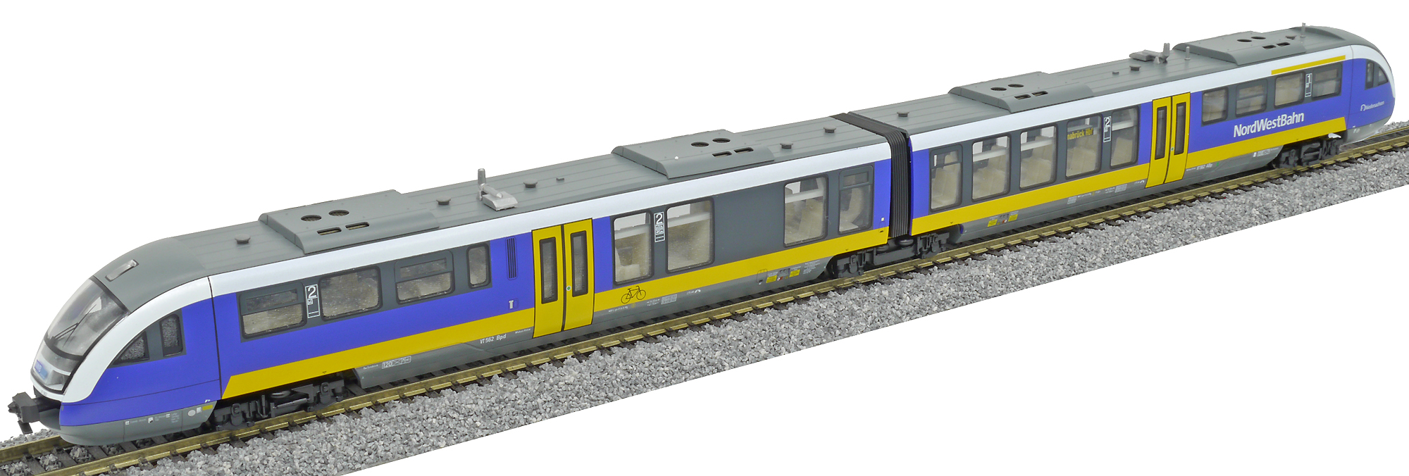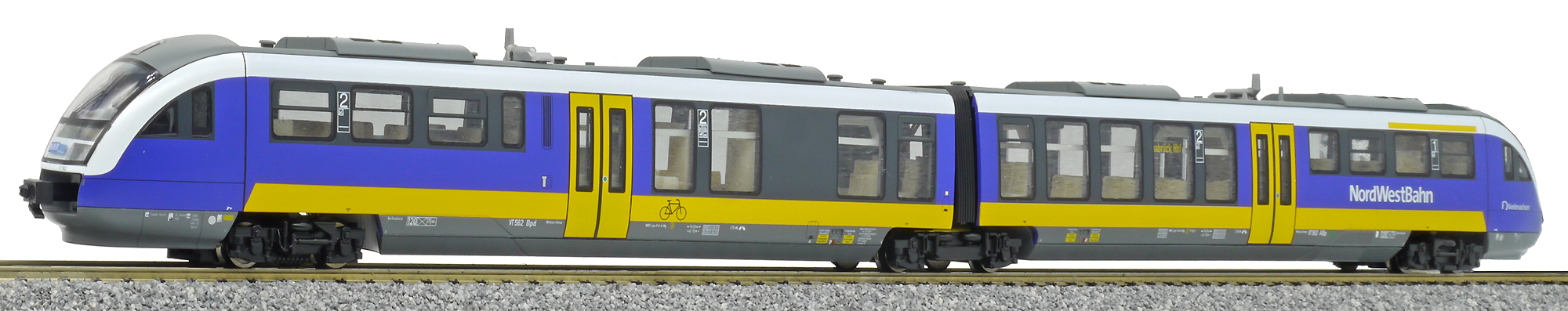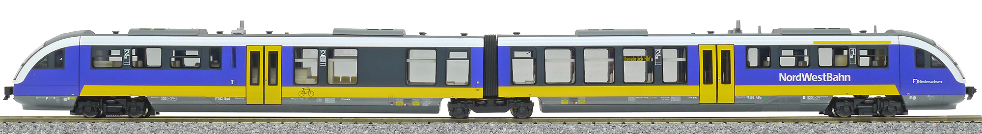 Popis   modrá se žlutým pruhem a doplňky, tmavěšedá střecha a pojezd "Nordwest