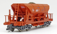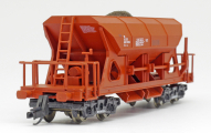 | nákladní samovýsypný vůz červenohnědý s opravnými fleky a s nákladem |