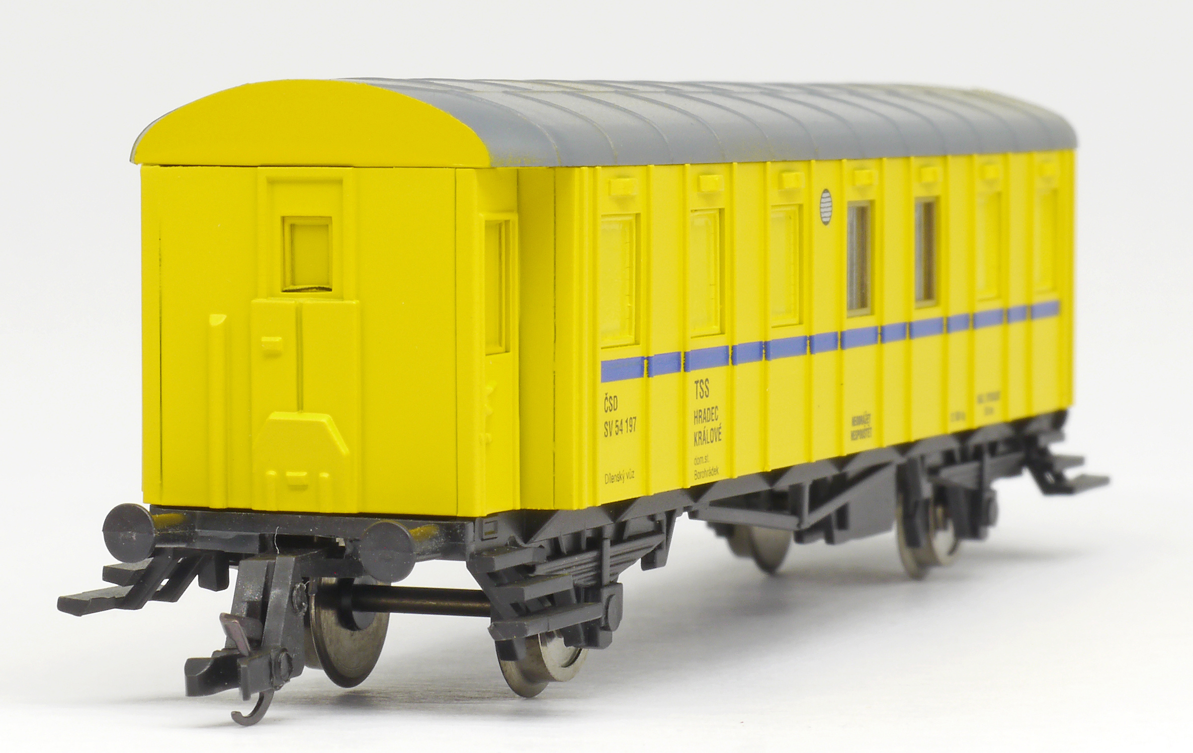 | dílenský vůz žlutý s modrým proužkem a šedou střechou |