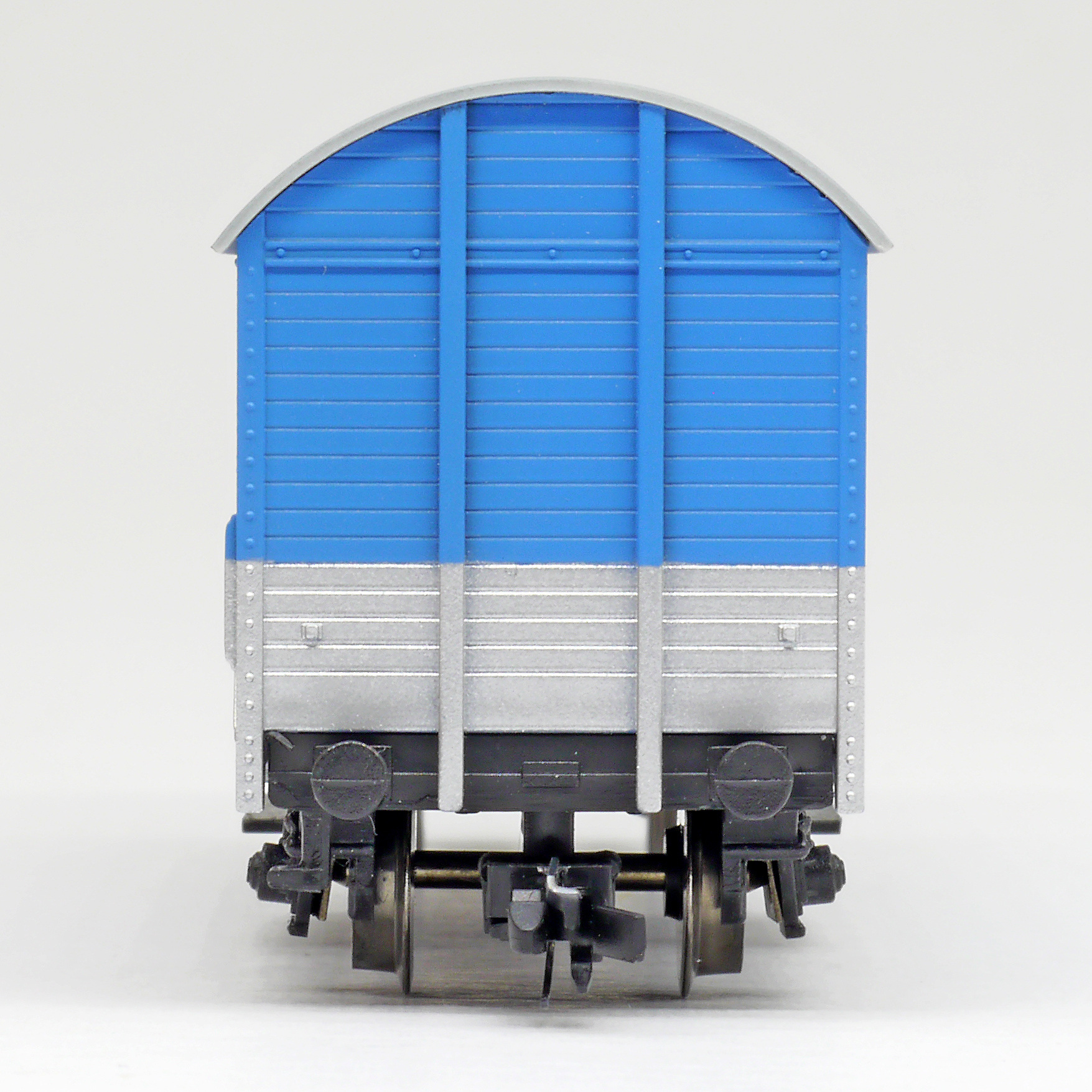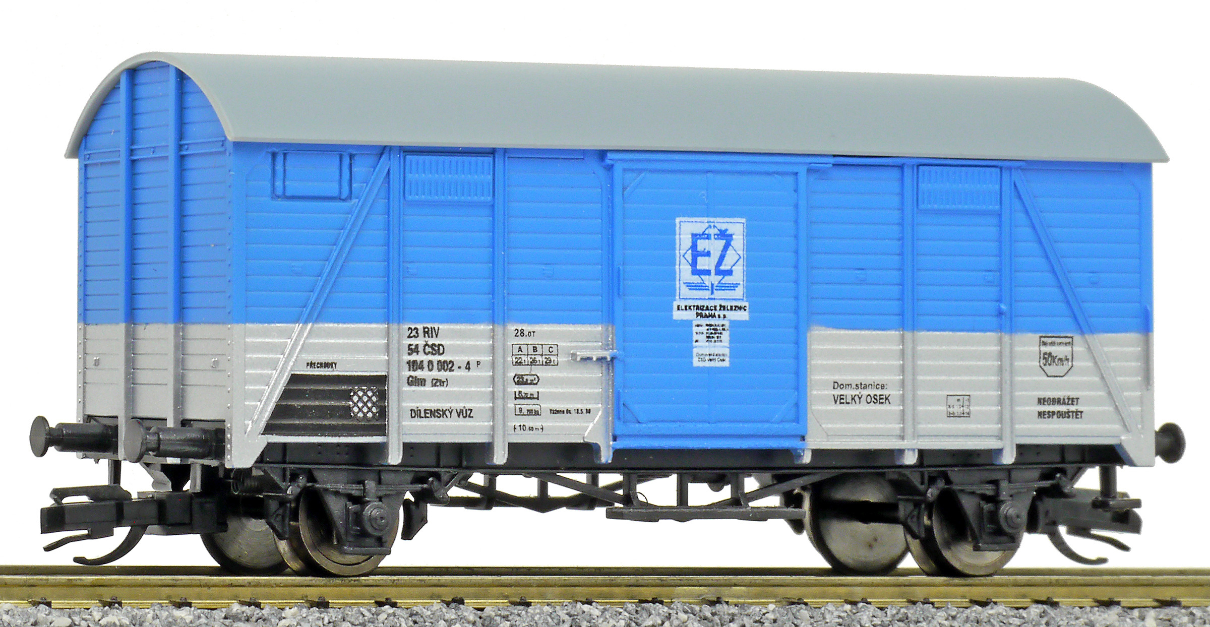 | krytý nákladní vůz modrý-stříbrný s šedou střechou dílenský vůz „Elektrizace železnic“ |