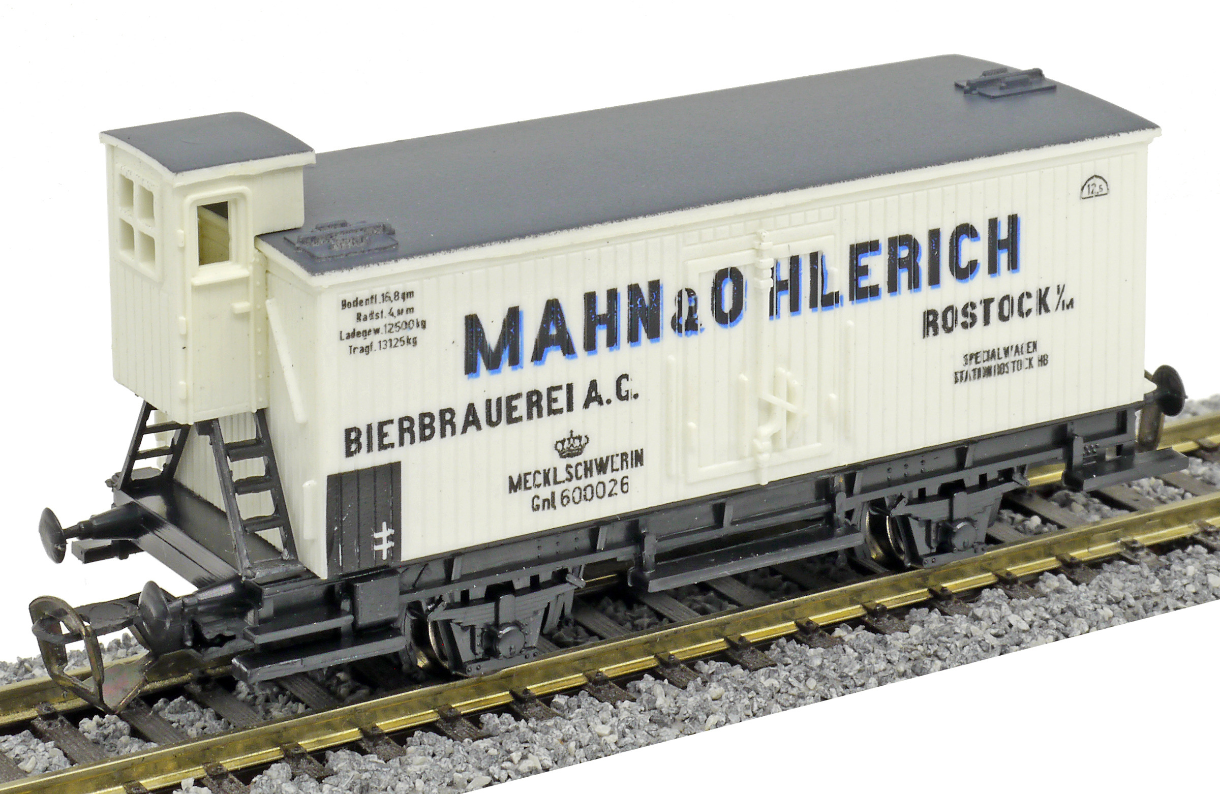| nákladní chladící vůz bílý s šedou střechou a brzdařskou budkou „Mahn & Ohlerich“ |