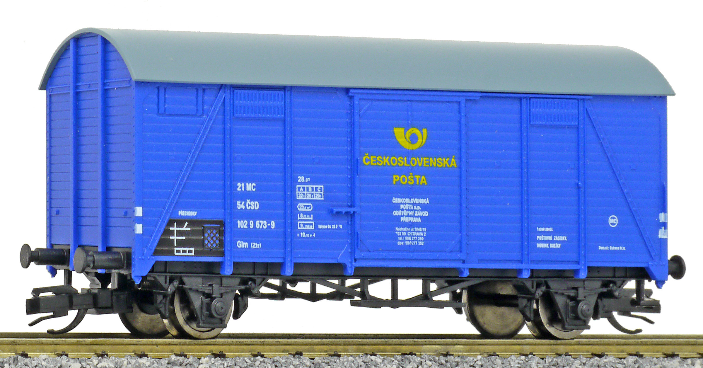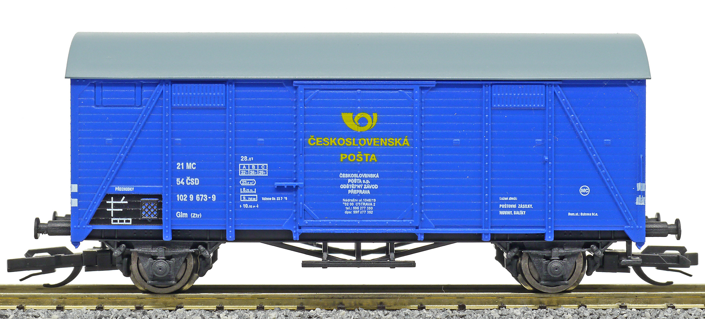 | krytý nákladní vůz modrý s šedou střechou „Československá pošta - Ostrava“ |