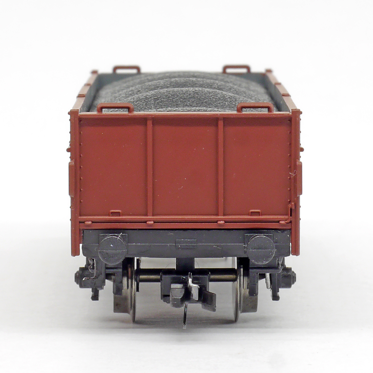 | otevřený nákladní vůz červenohnědý s nákladem uhlí |