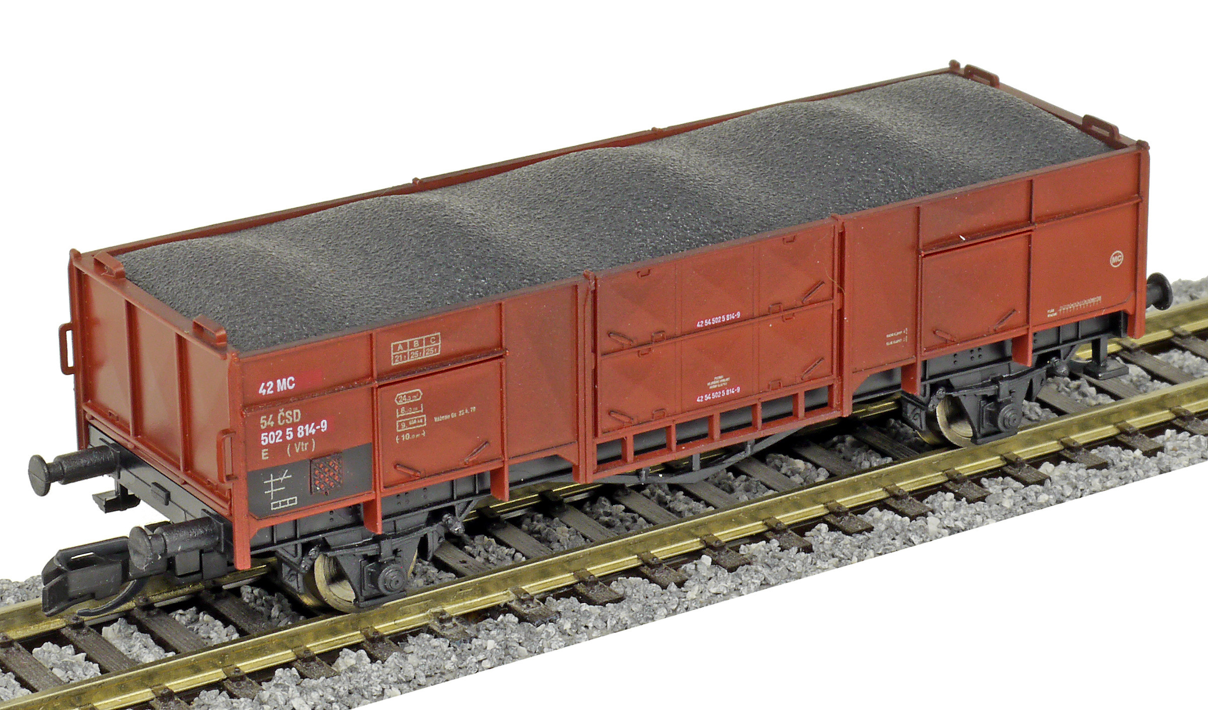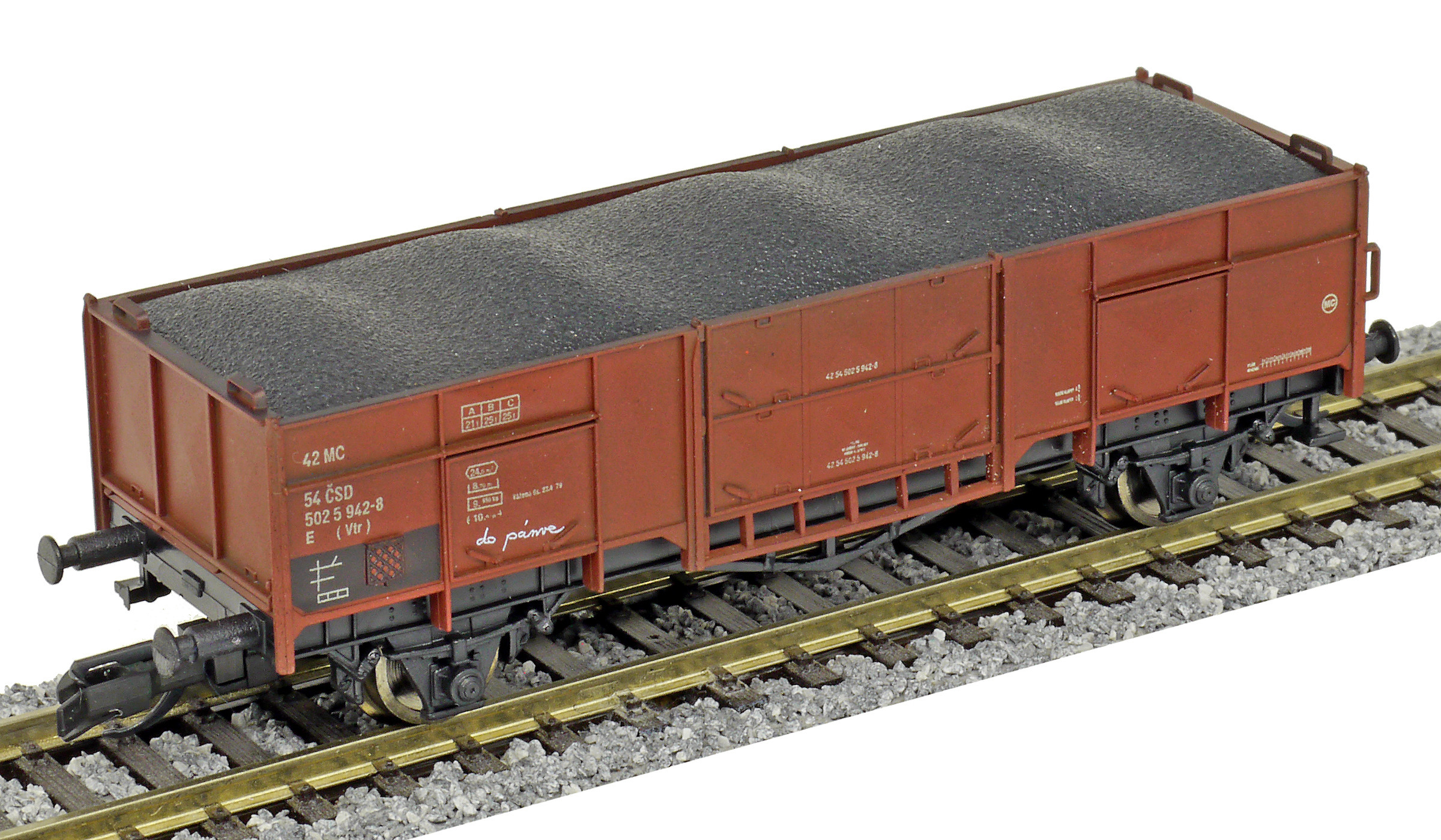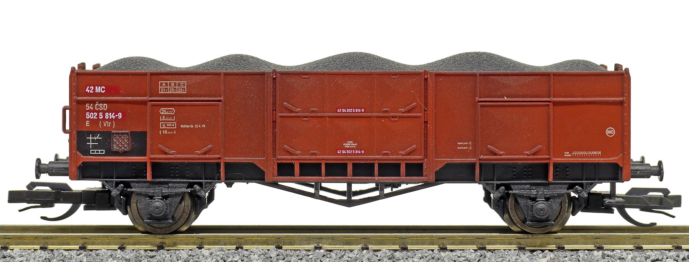 | otevřený nákladní vůz červenohnědý s nákladem, přetisky čísla vozu |