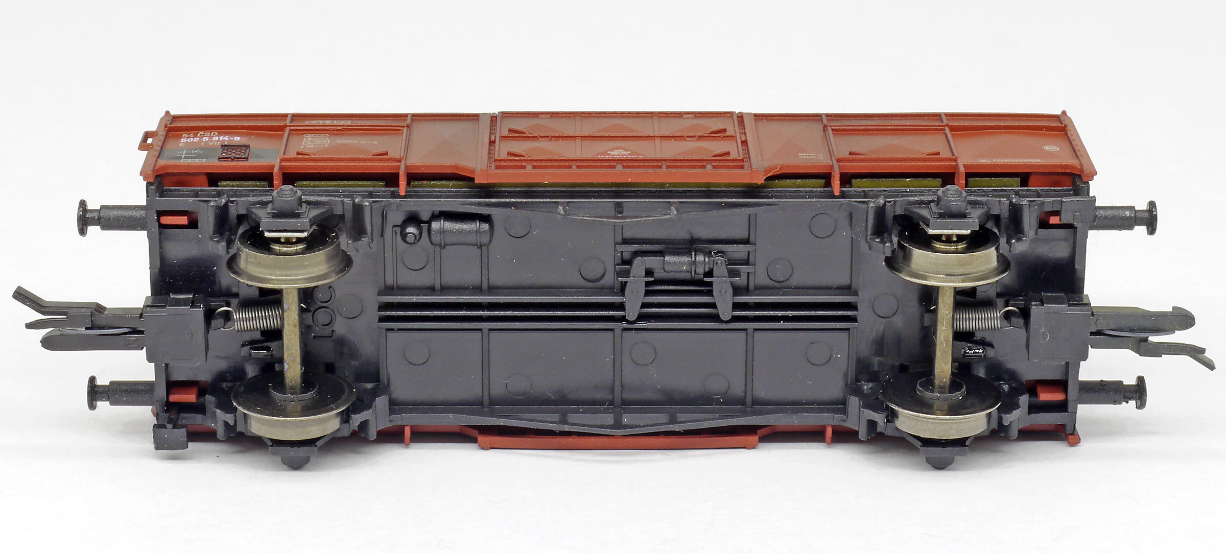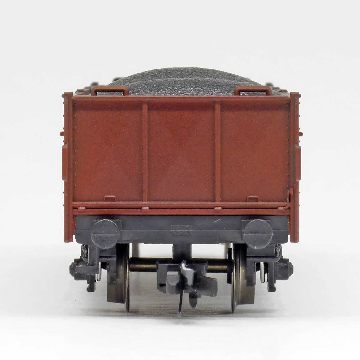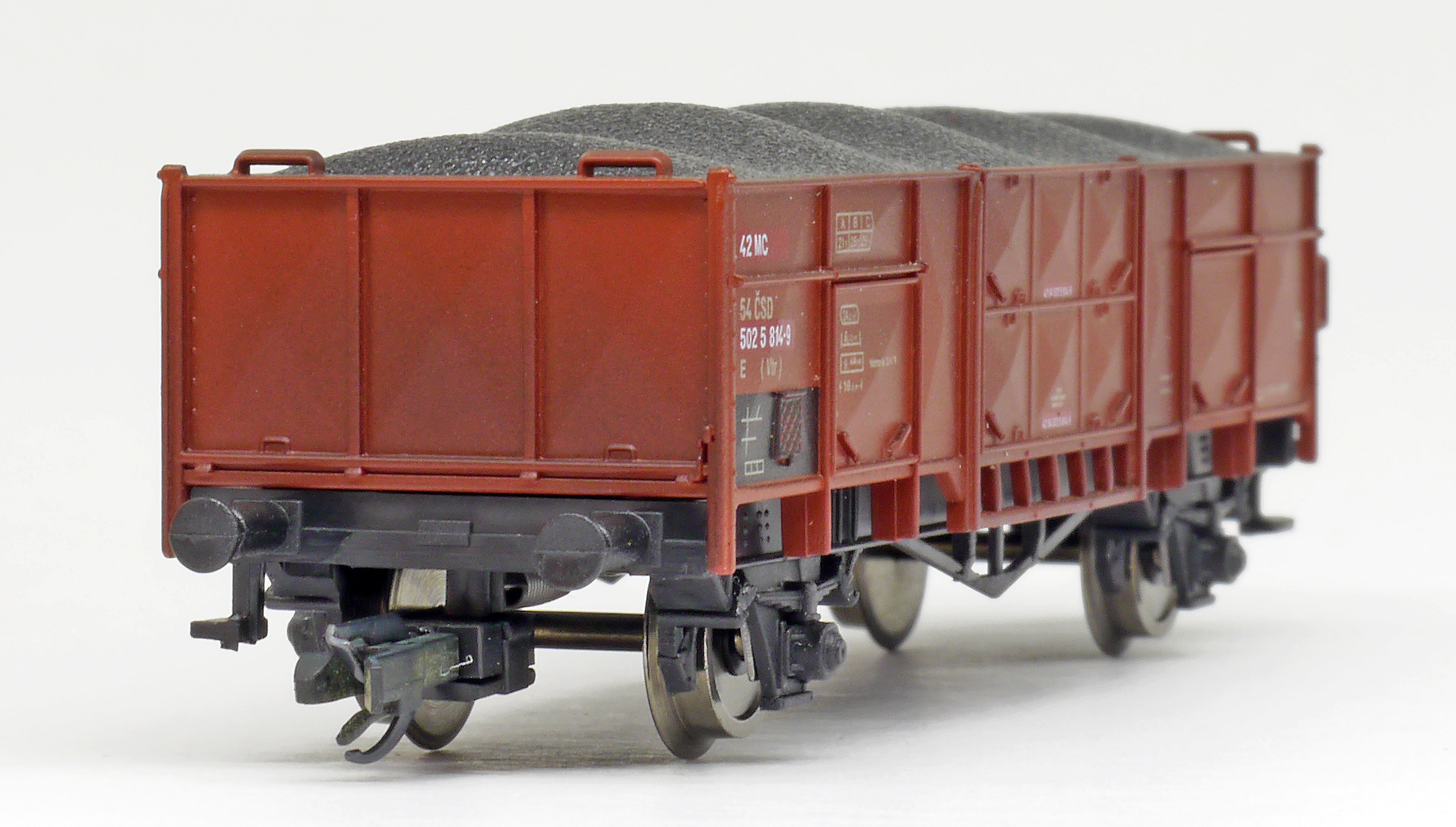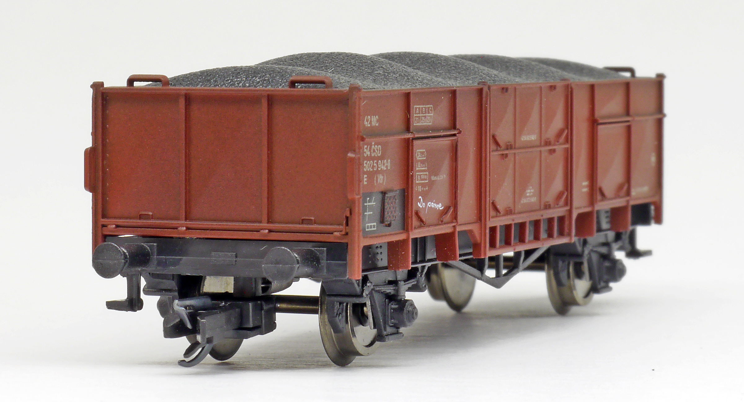 | otevřený nákladní vůz červenohnědý s nákladem, přetisky čísla vozu |