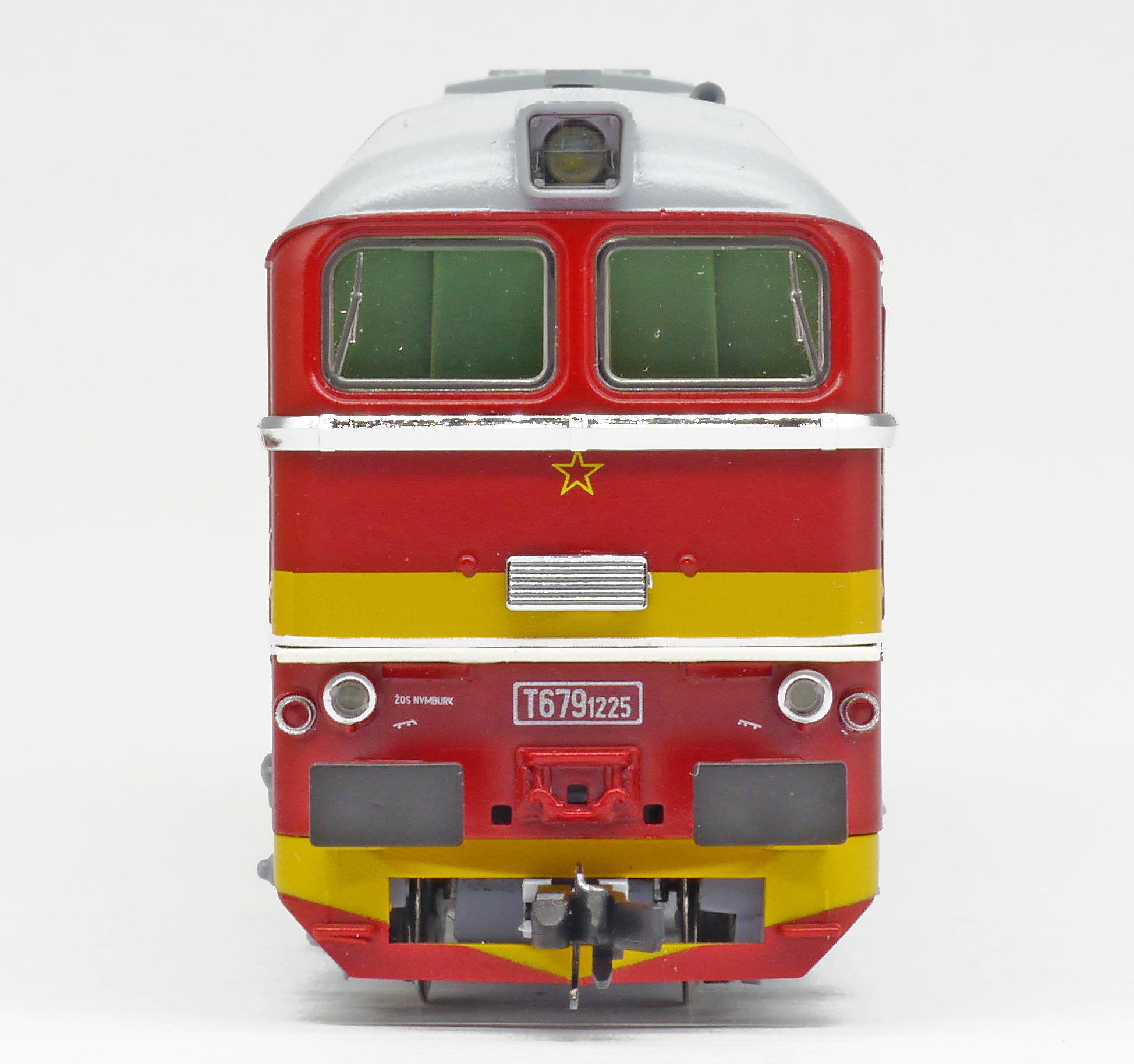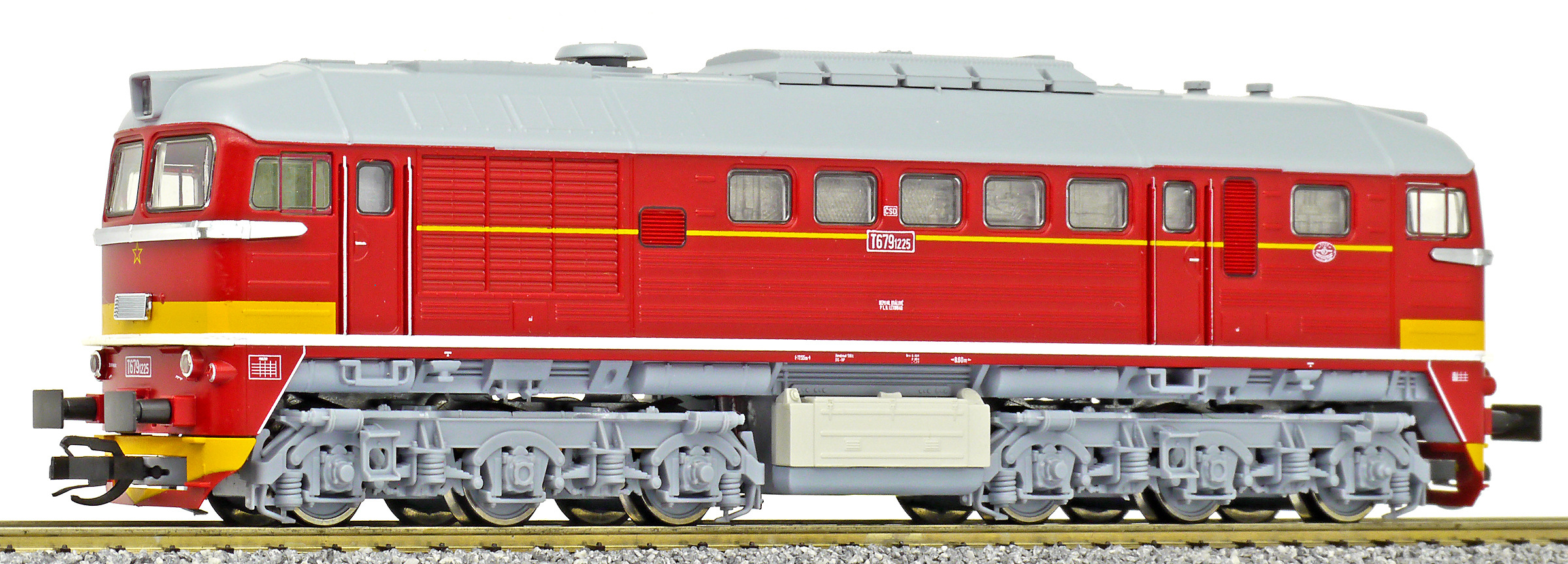Popis   dieselová lokomotiva červená s šedou střechou a pojezdem, oranžový pás na čelech