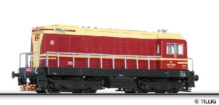 | dieselová lokomotiva červená s krémovou střechou, černým rámem a pojezdem |