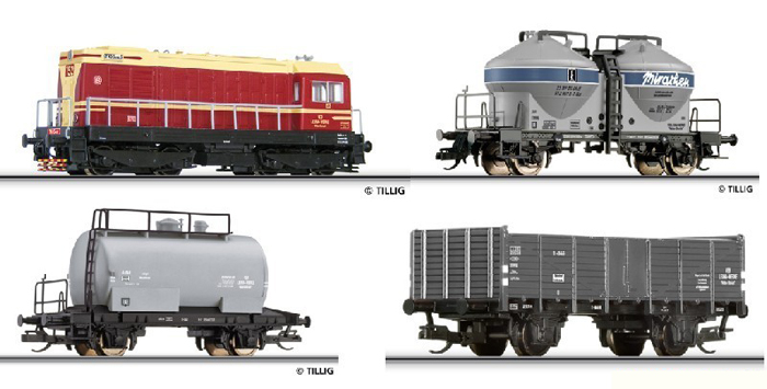| set dieselové lokomotivy V75 a tří nákladních vozů Leuna |