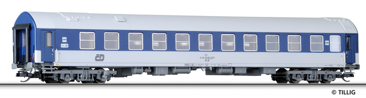 | lůžkový vůz modrý-bílý se světle šedou střechou |