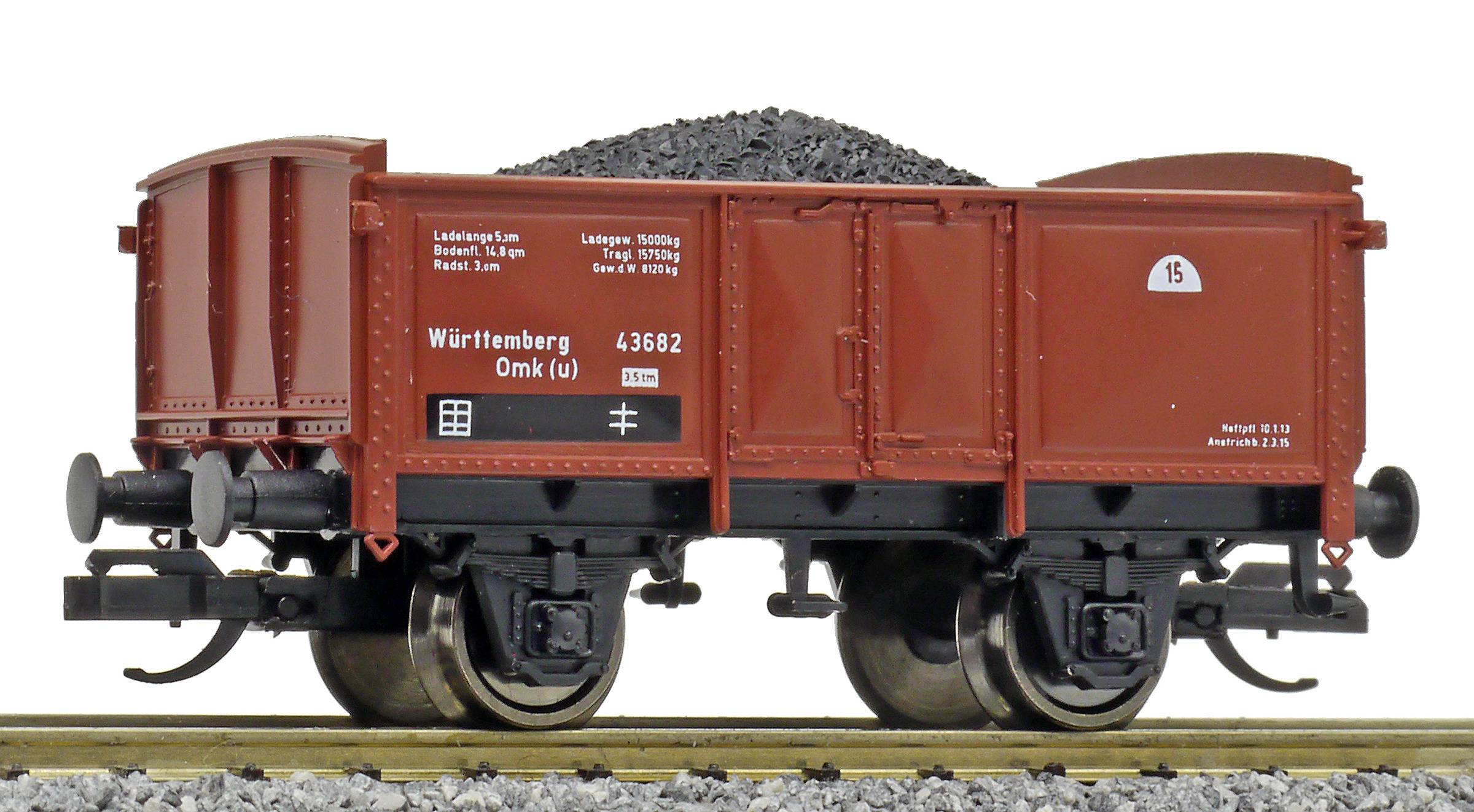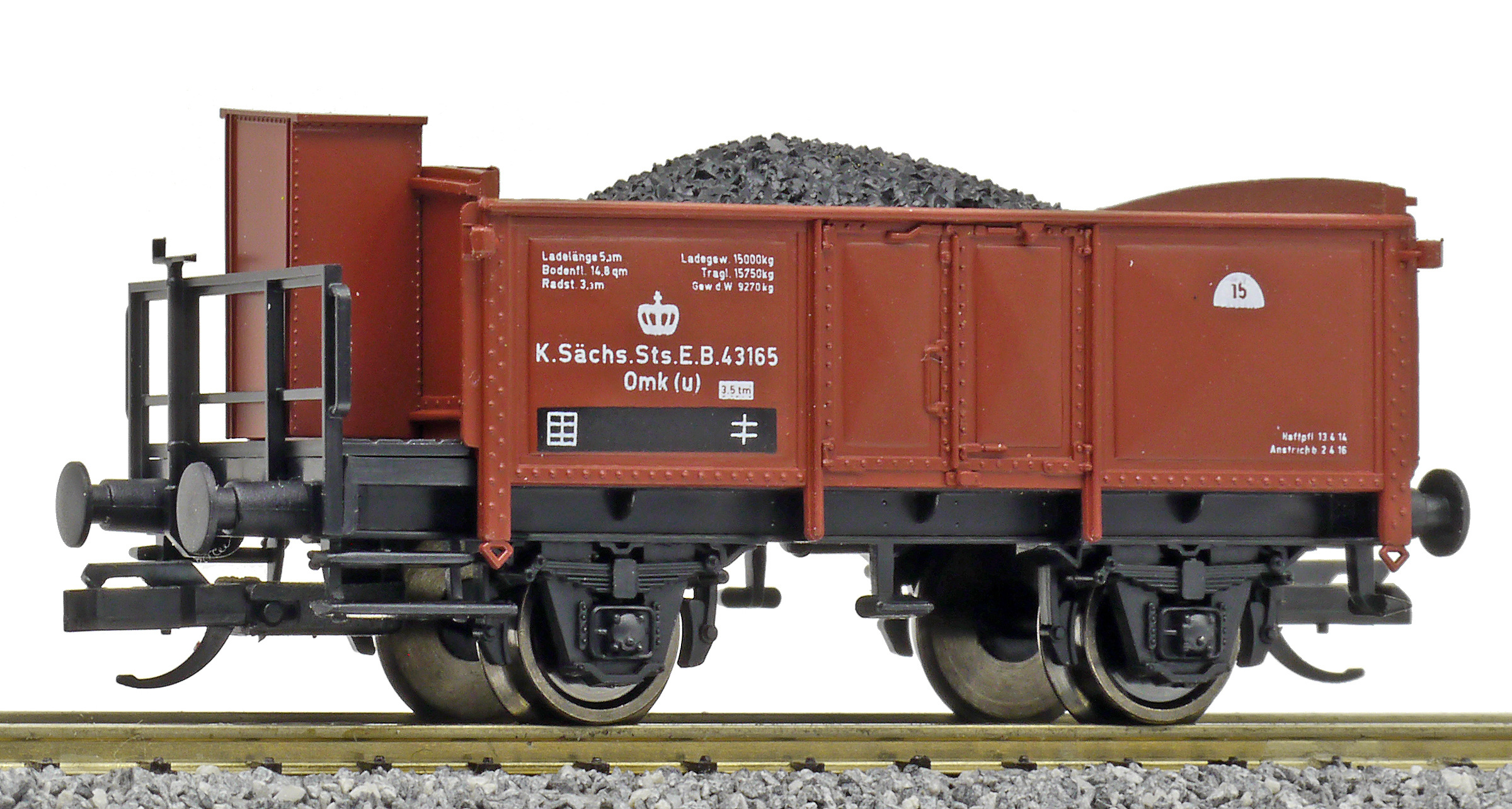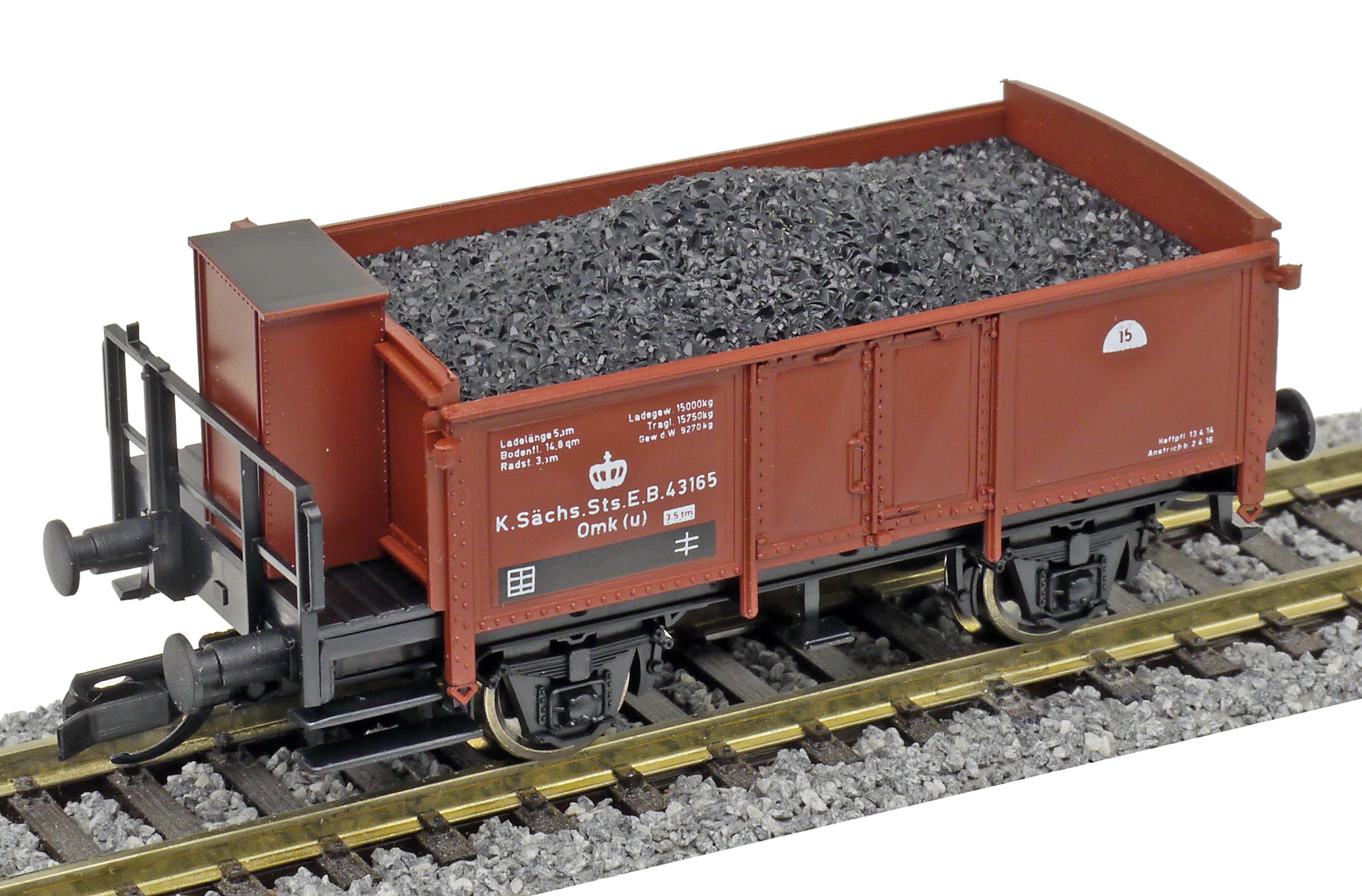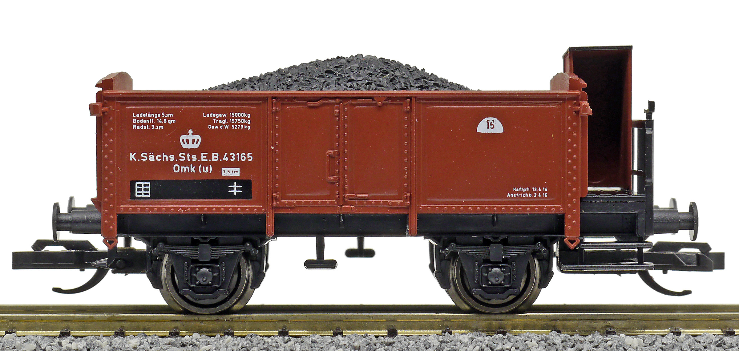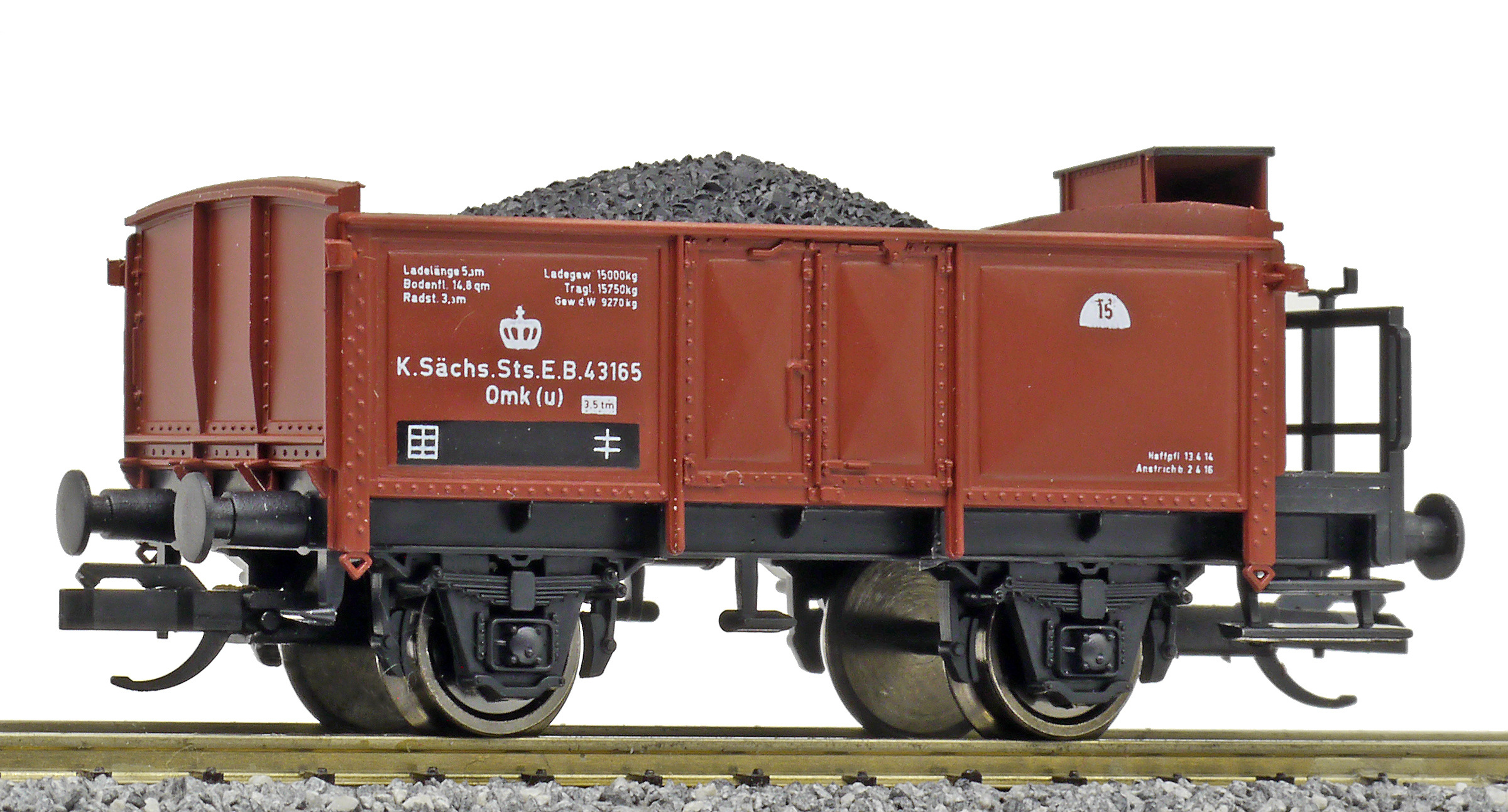 | otevřený nákladní vůz červenohnědý s brzdařskou budkou ložený uhlím |