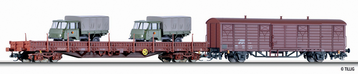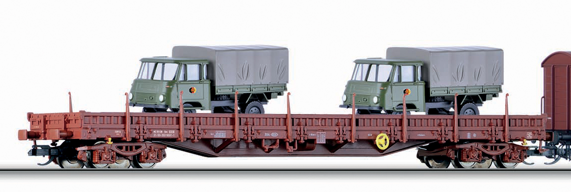 | nízkostěnný nákladní vůz červenohnědý s nákladem vojenských vozů „Militärtransport“ |