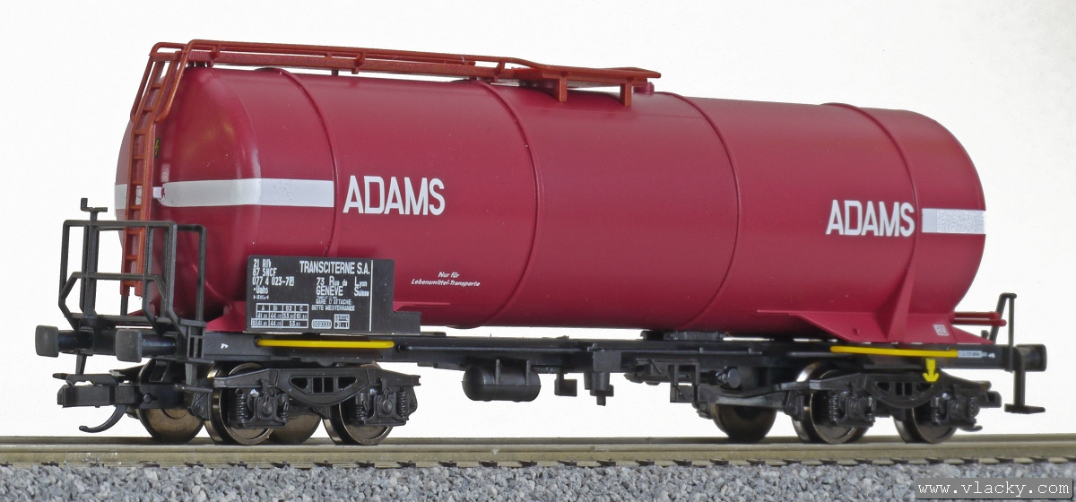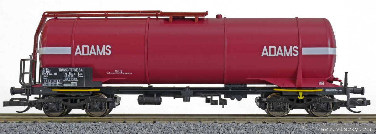 | tmavě červená s bílými pásy a logem „ADAMS Transciterne S.A.“ |
