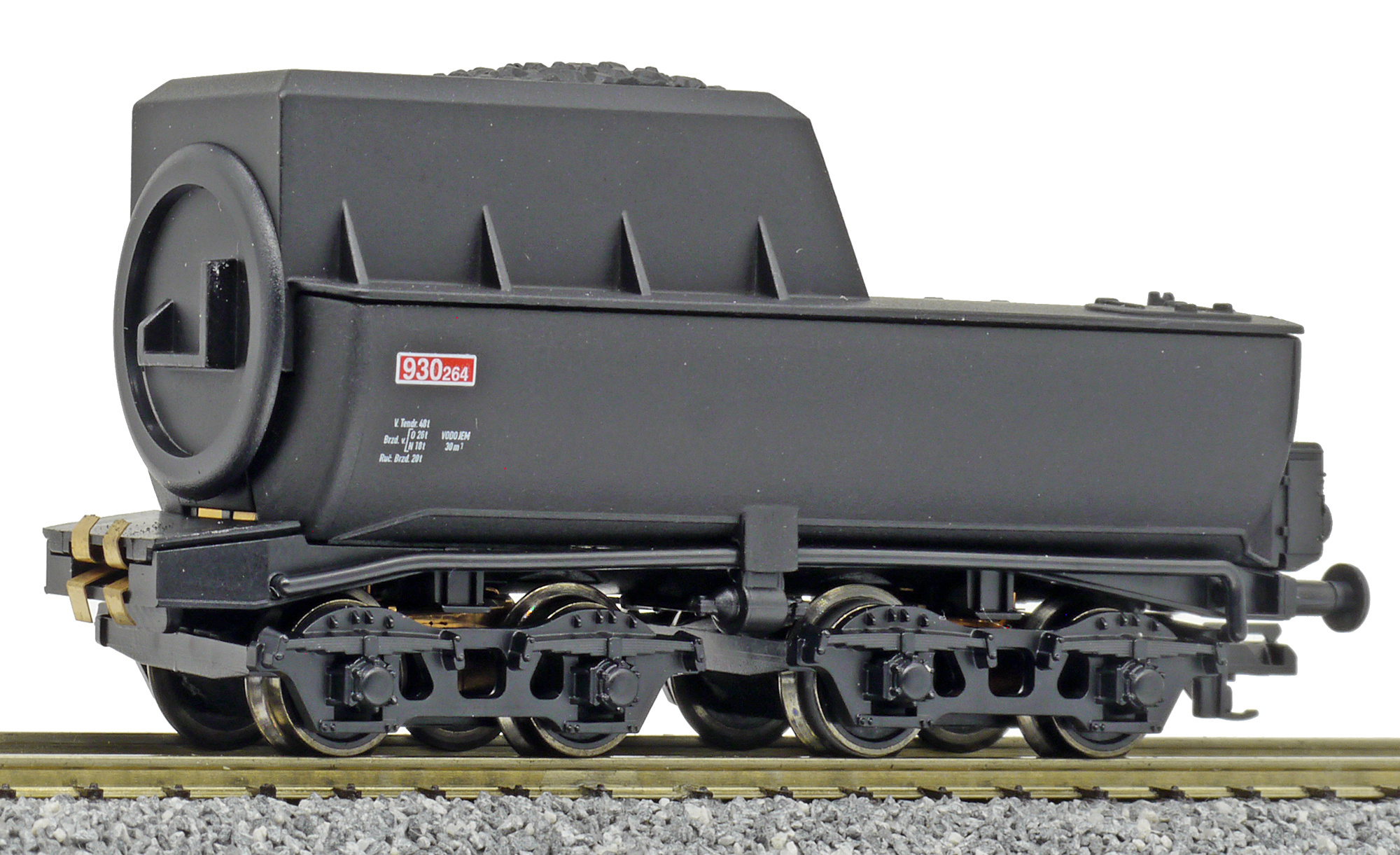 | parní lokomotiva černá s kouřovými plechy, černý pojezd, vanový tendr |