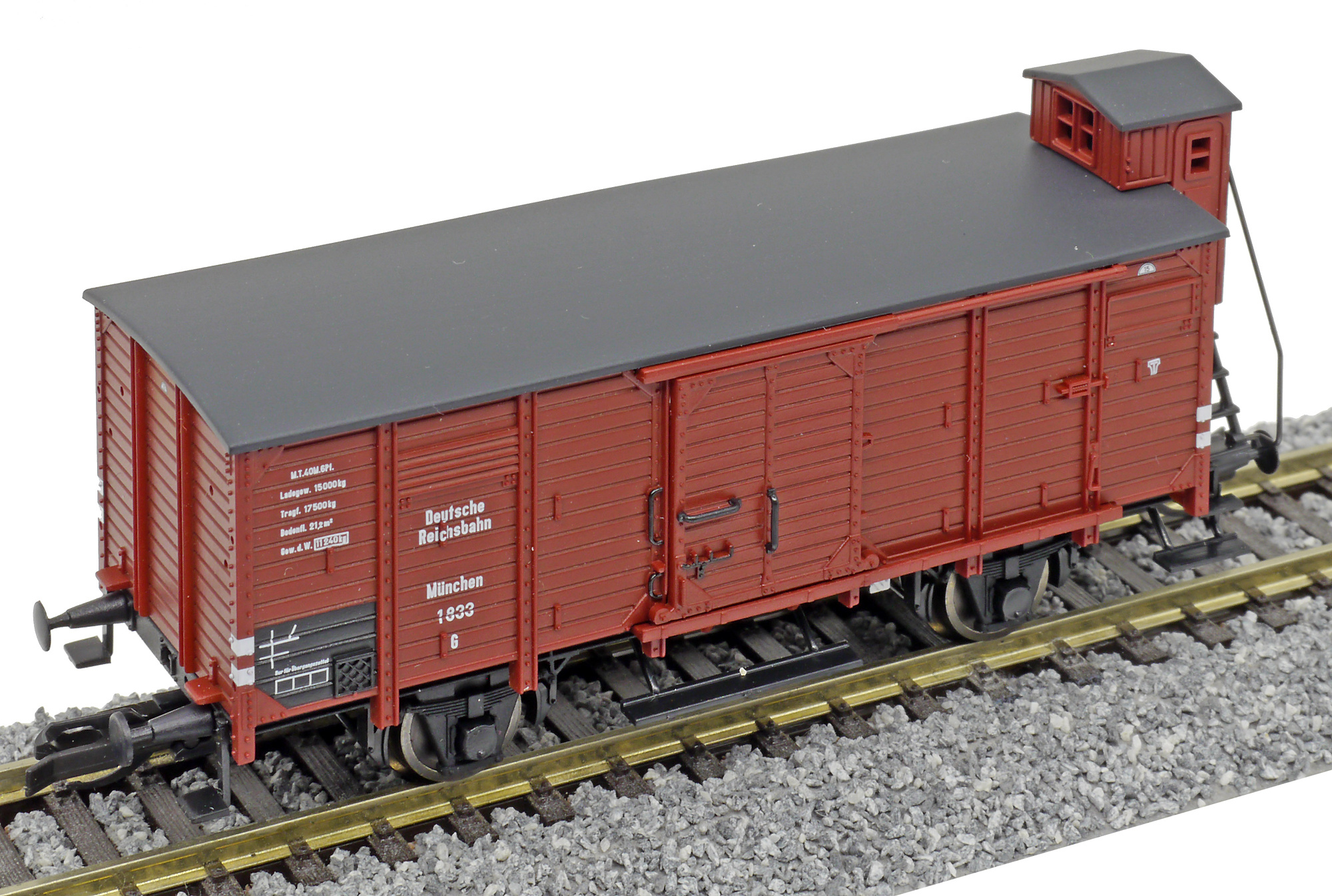 | krytý nákladní vůz červenohnědý s brzdařskou budkou |