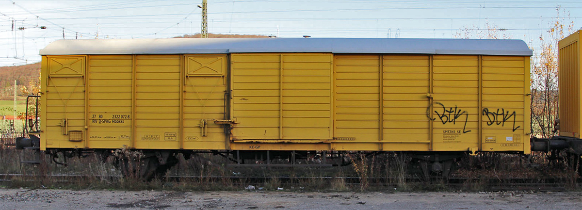 | krytý nákladní vůz žlutý s šedou střechou do pracovního vlaku „Spitzke AG“ |