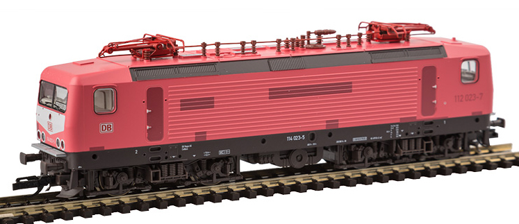 | elektrická lokomotiva červená se záplatami, přeznačená původní BR 112 023-7 |