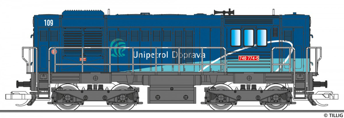 | dieselová lokomotiva v barevném schematu „Unipetrol Doprava“ |