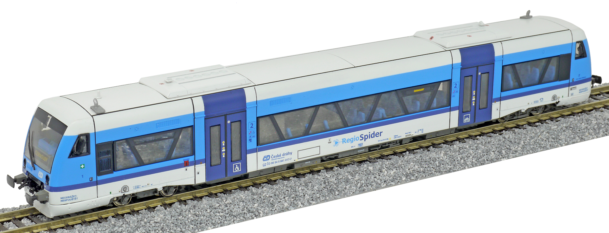 | motorový vůz v barevném schematu „Najbrt“ s logem „RegioSpider“ |