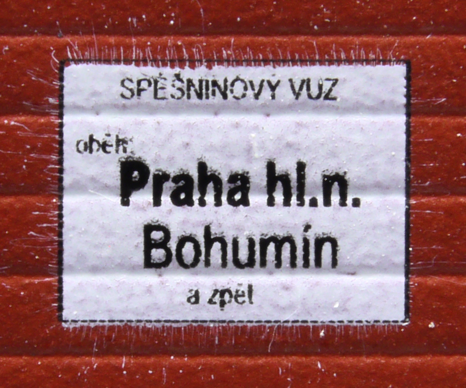 | krytý nákladní spěšninový vůz červenohnědý „Praha hl.n. - Bohumín“ |