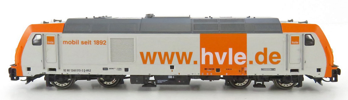 | dieselová lokomotiva bílá-oranžová s šedou střechou s potiskem „www.hvle.de“ |