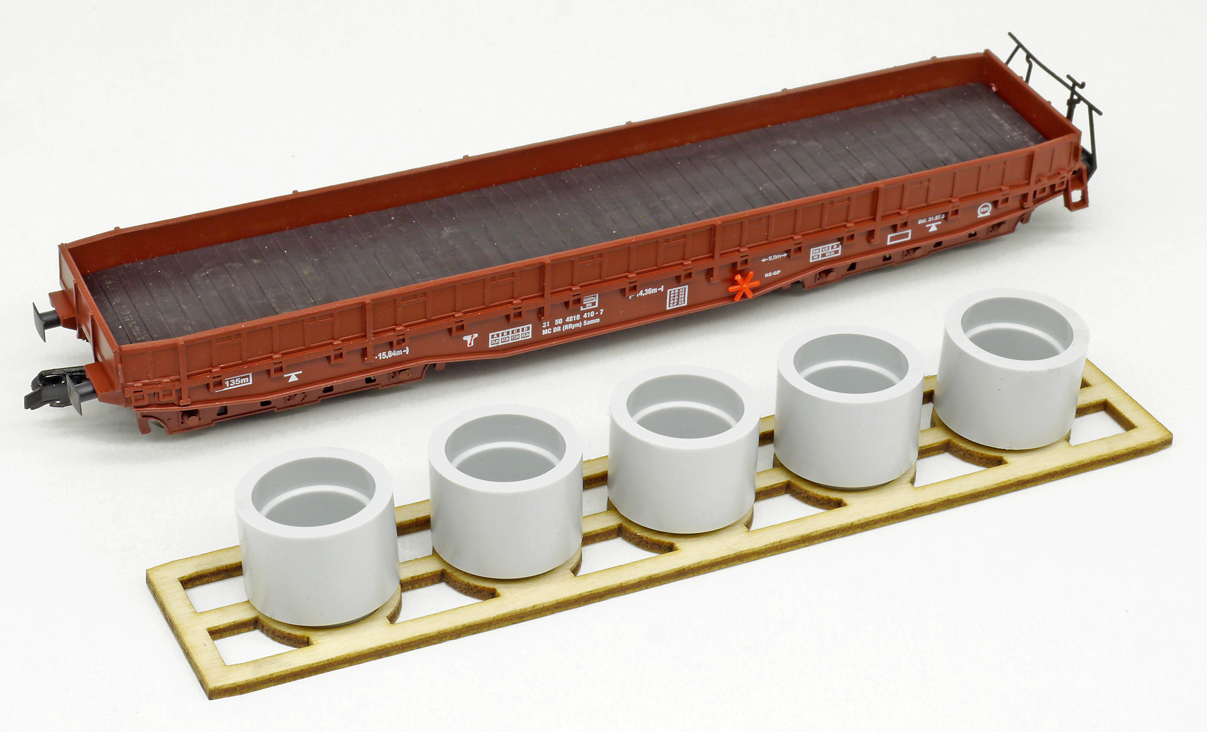 | nízkostěnný nákladní vůz červenohnědý s nákladem betonových skruží |
