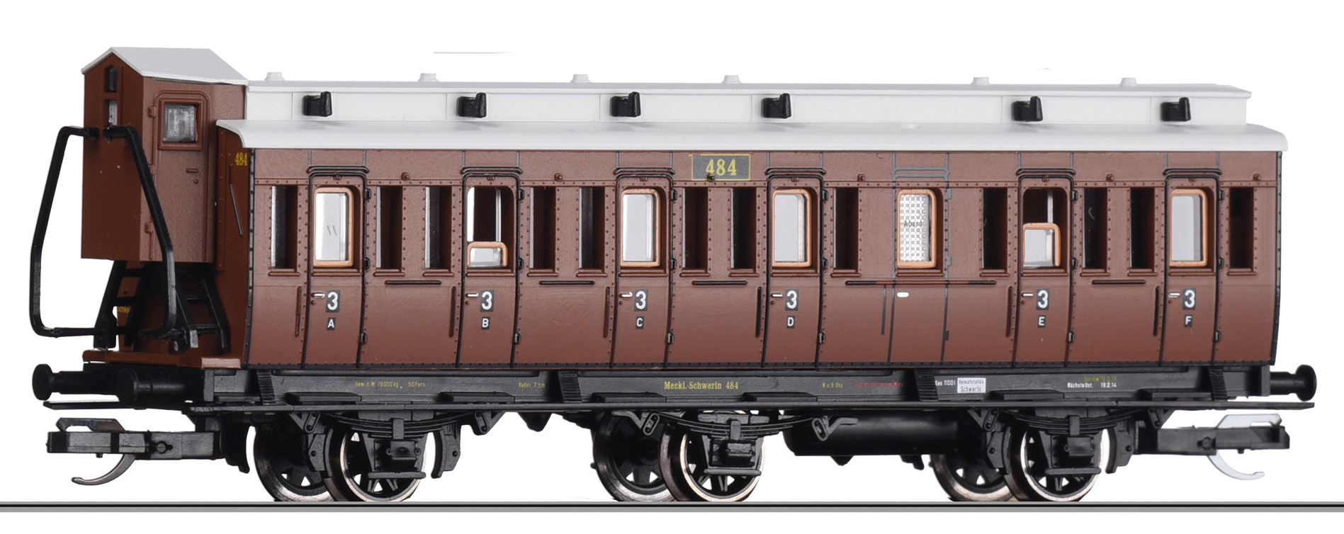 | oddílový osobní vůz červenohnědý se světle šedou střechou 3. tř. „Mecklenburgischer Reisezug 2“ |