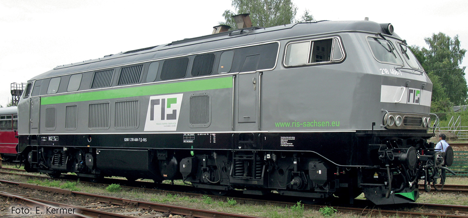 | dieselová lokomotiva v barevném schematu „Regio Infra Service Sachsen GmbH“ |