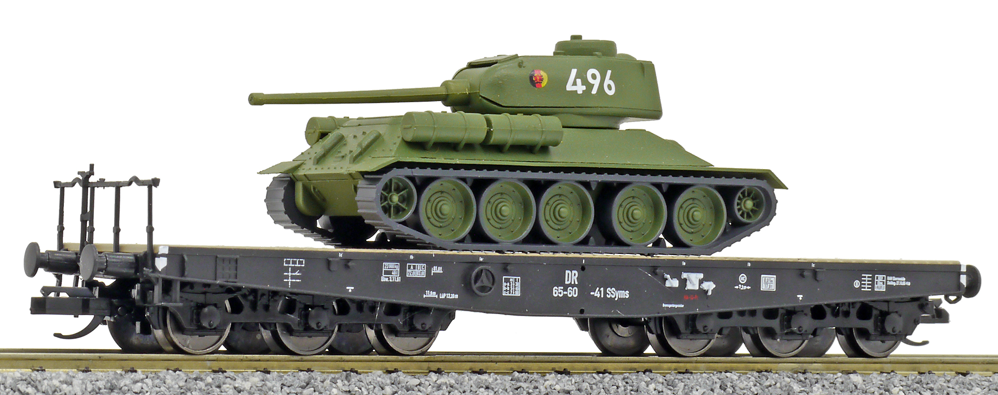 plošinový nákladní vůz černý s nákladem tanku T38/85