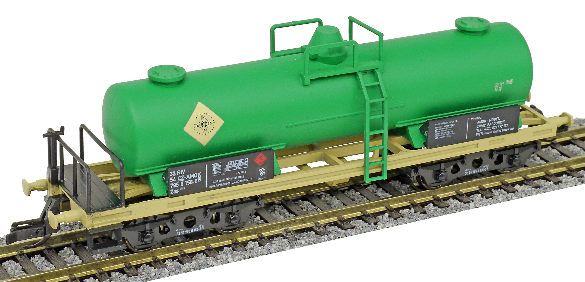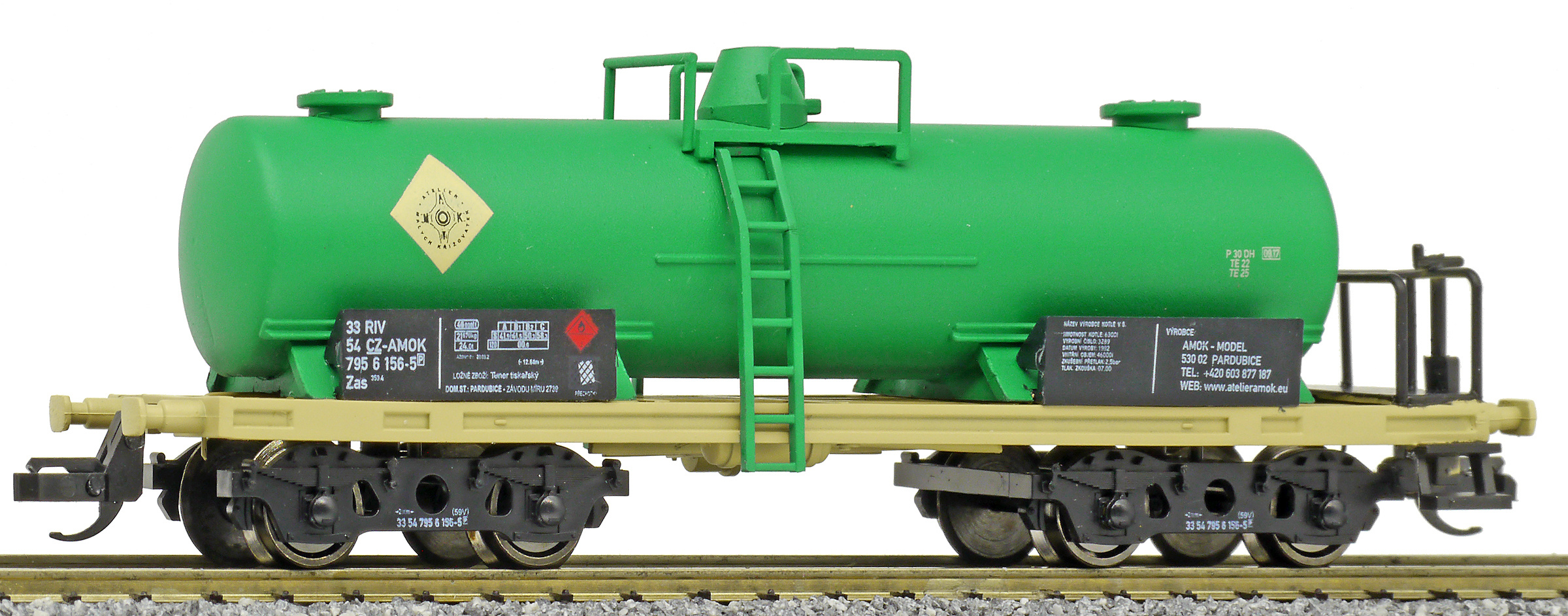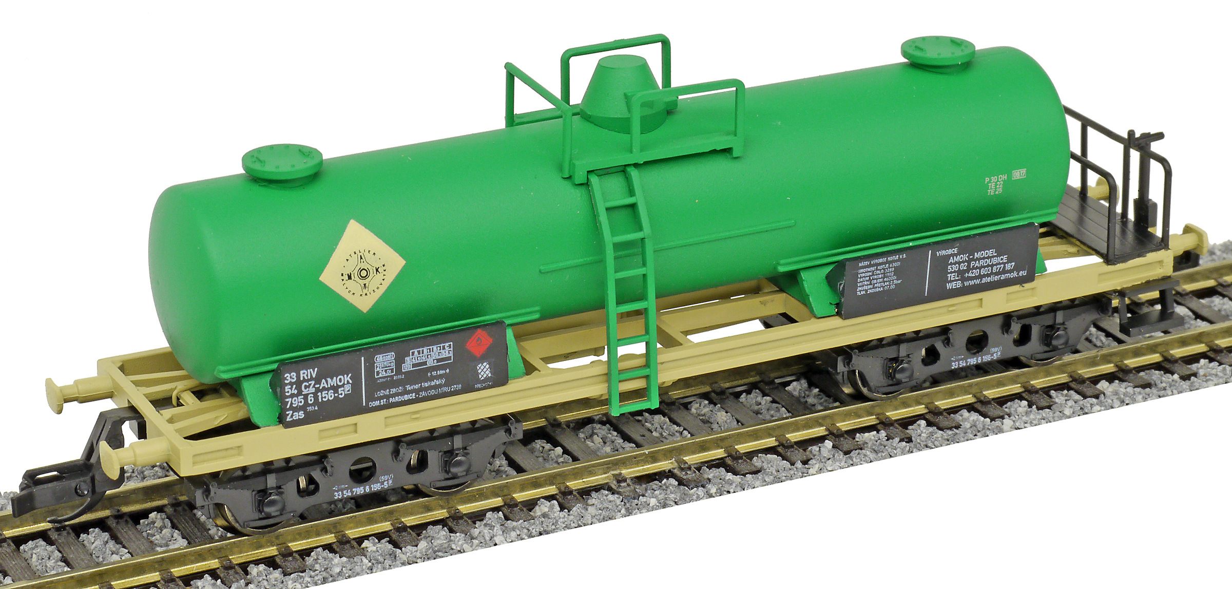 | kotlový vůz zelený s brzdařskou plošinou „AMOK“ |
