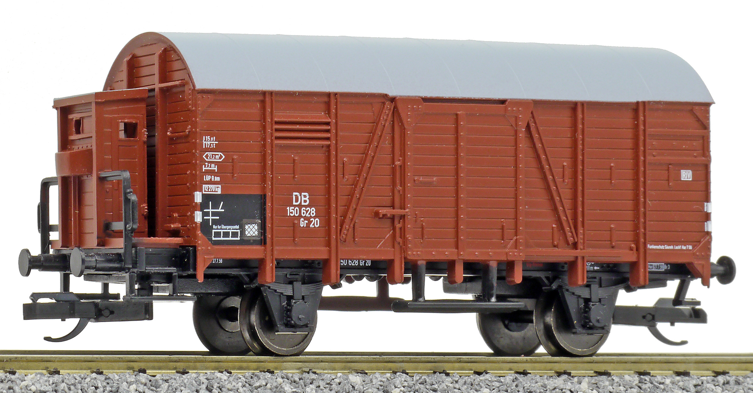 | krytý nákladní vůz červenohnědý s šedou střechou a s brzdařskou budkou |