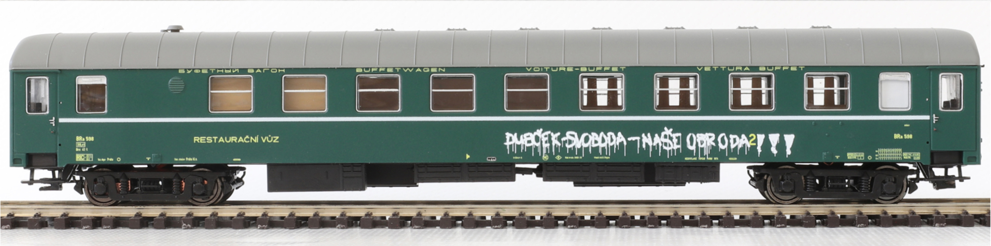 | restaurační vůz zelený s šedou střechou 2. tř., Praha |