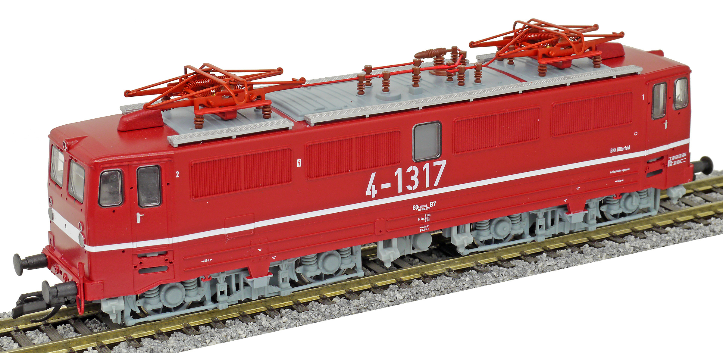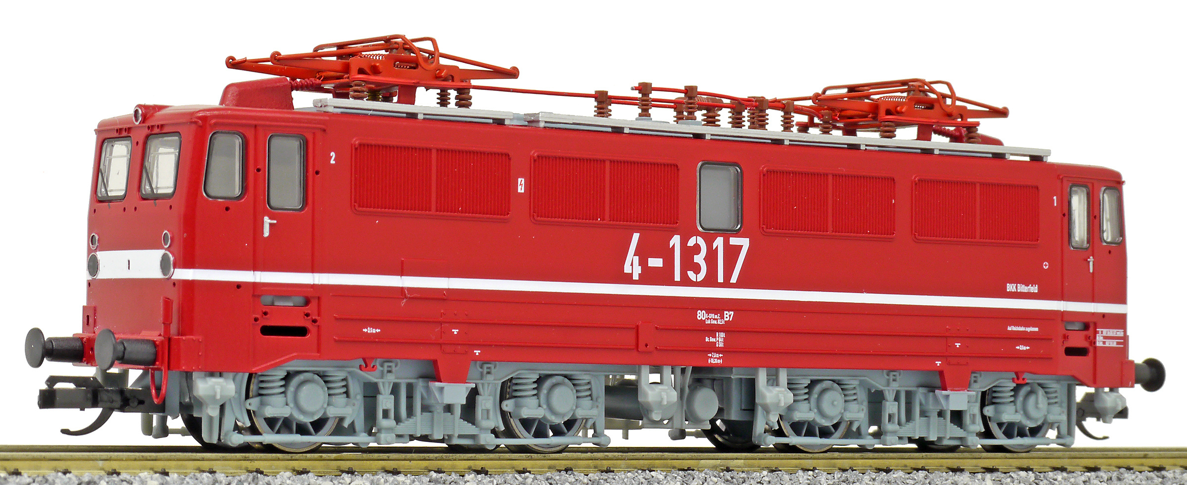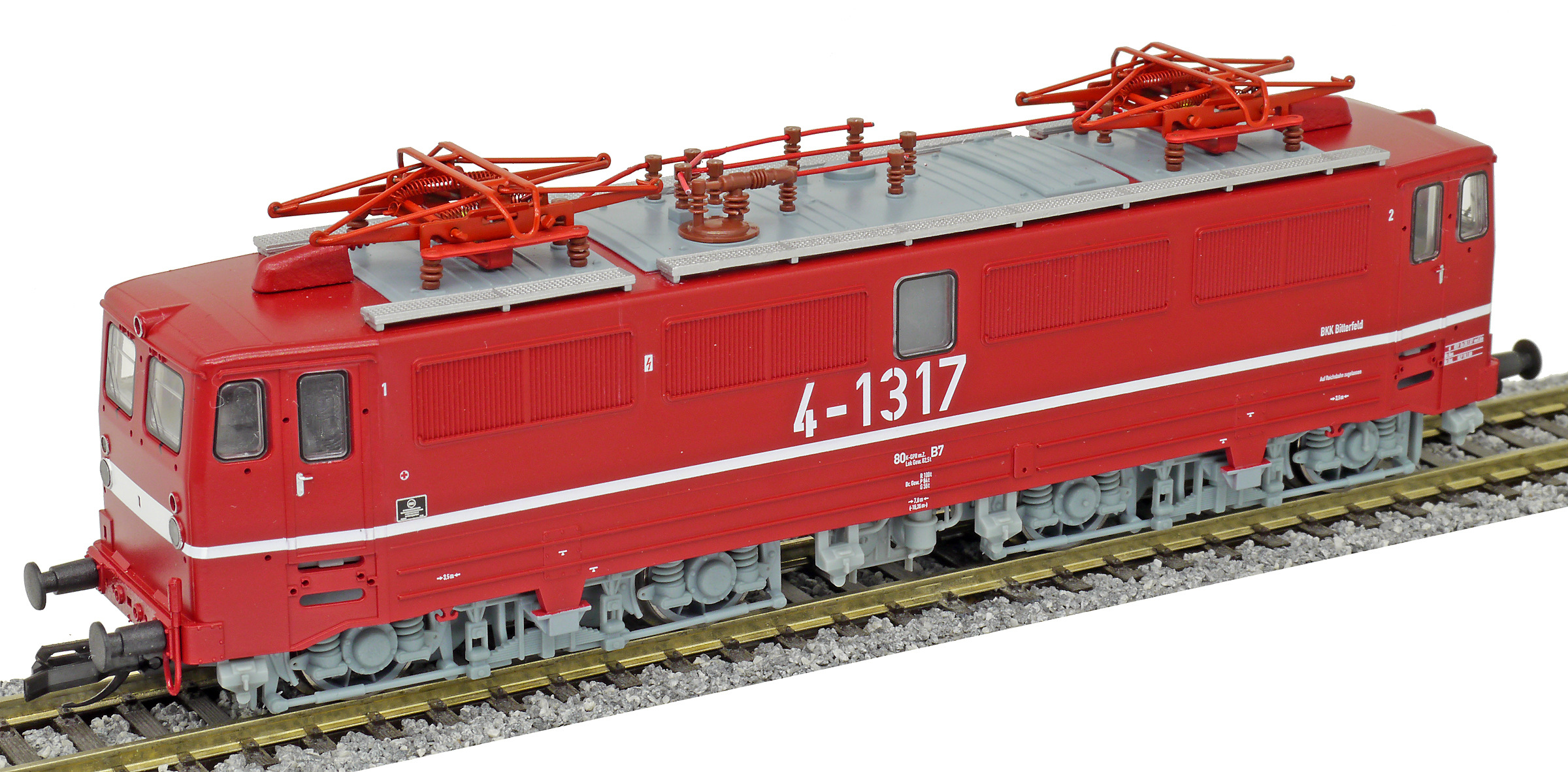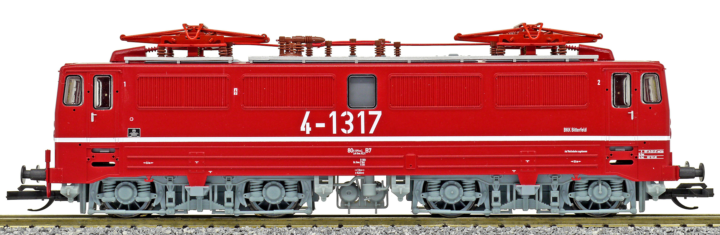 | elektrická lokomotiva červená se světle šedými podvozky „BKK Bitterfeld“ |