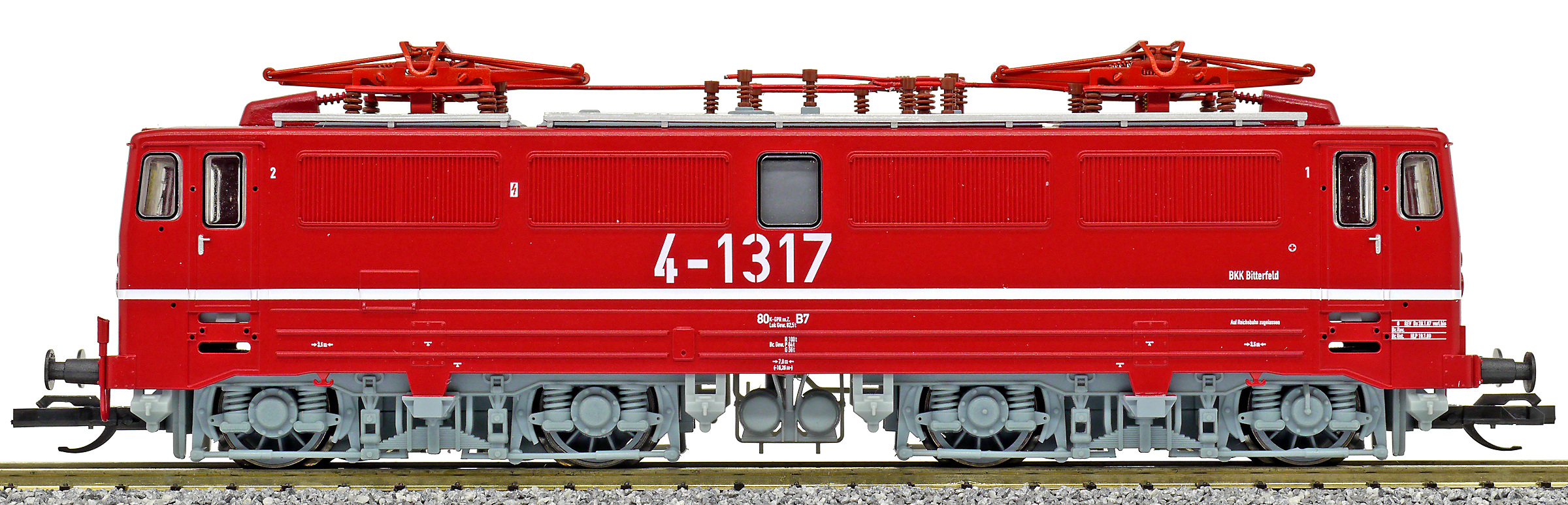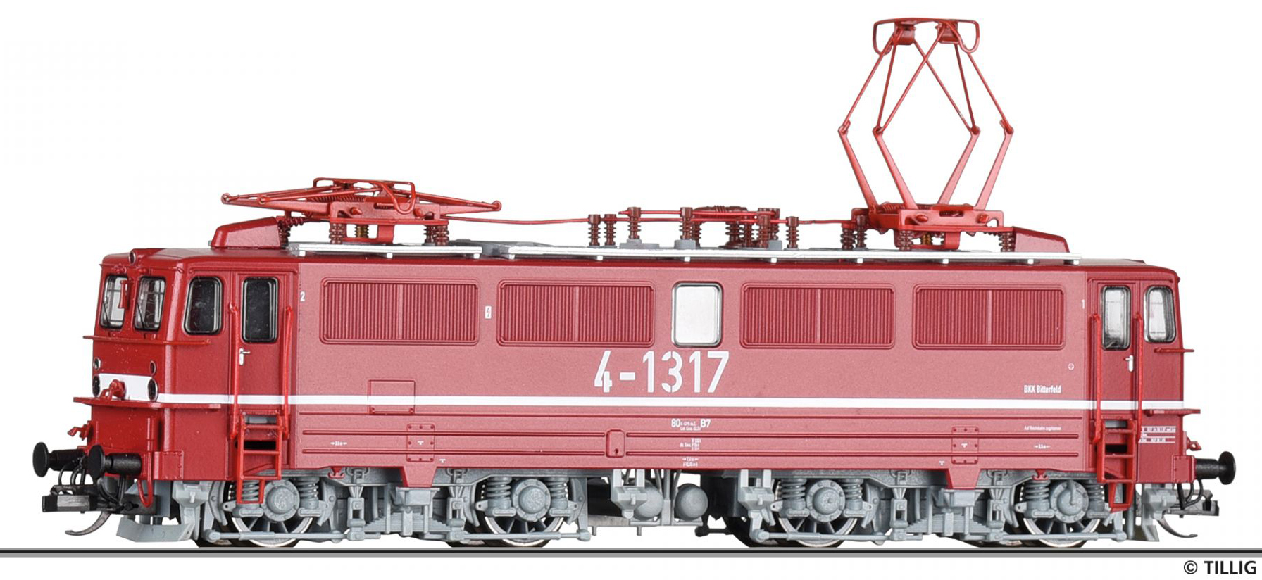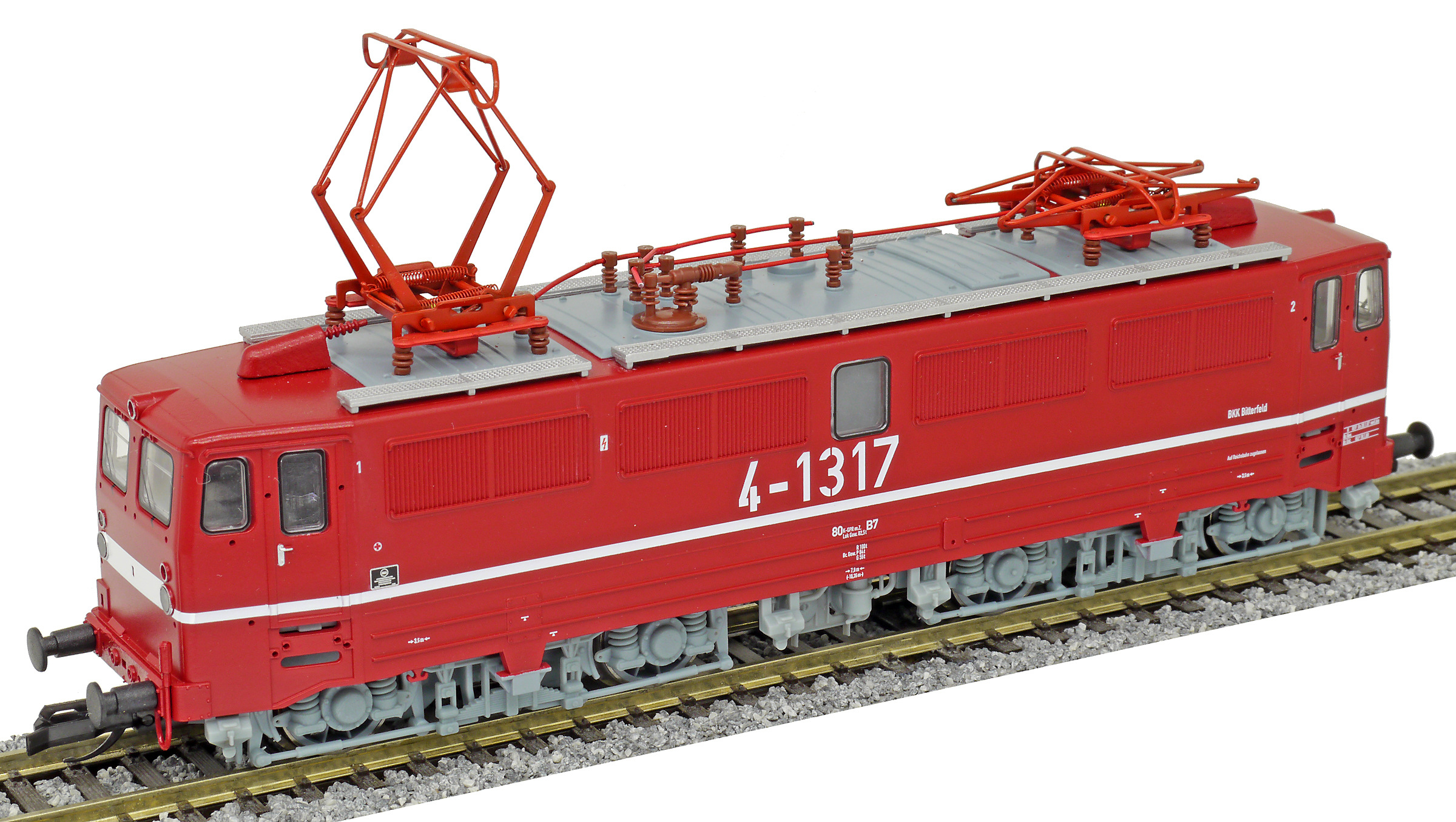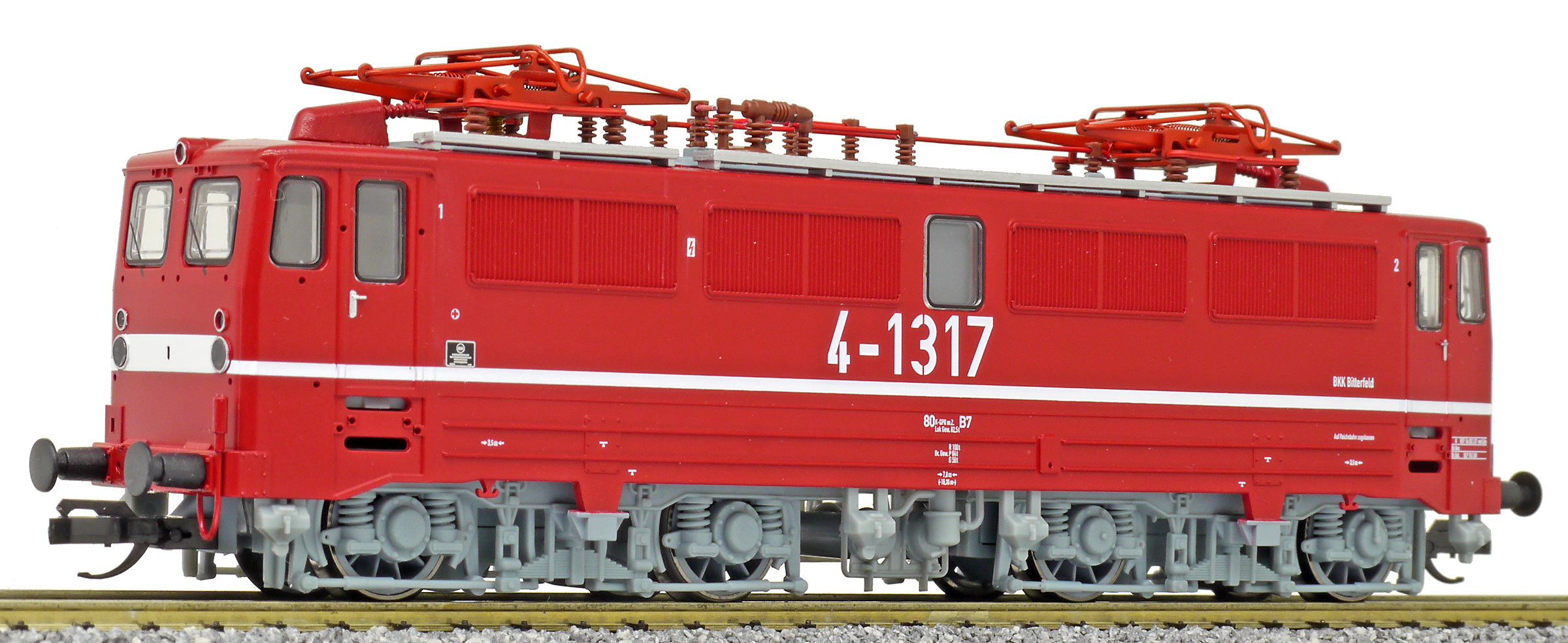 | elektrická lokomotiva červená se světle šedými podvozky „BKK Bitterfeld“ |