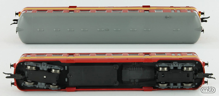 Popis   motorový vůz červený s výstražným pruhem a s šedou střechou