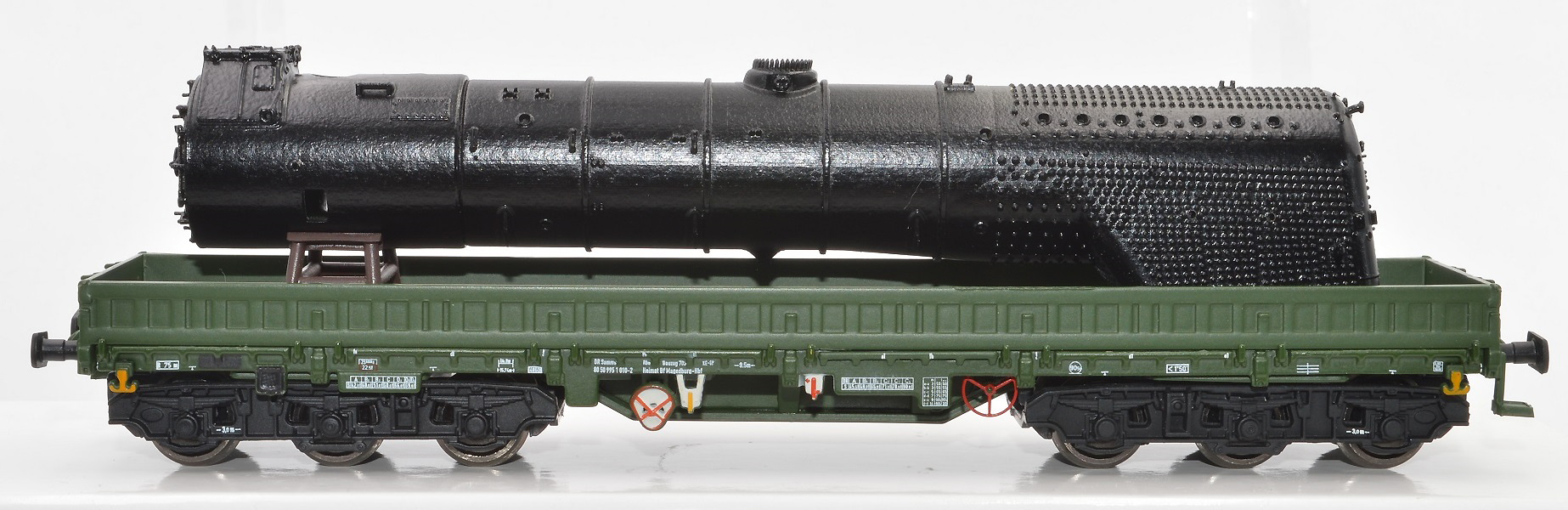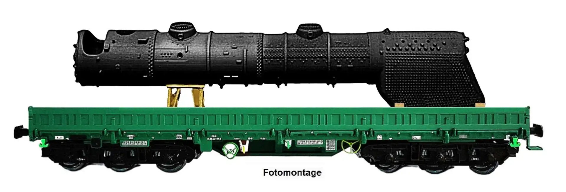 | nízkostěnný nákladní vůz zelený do pracovního vlaku s nákladem kotle lokomotivy BR 41 |