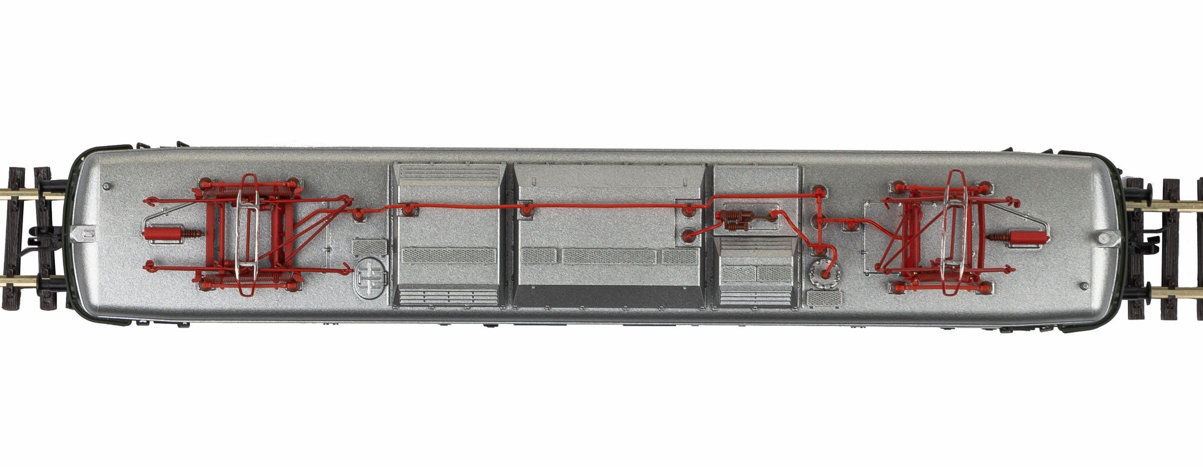 | elektrická lokomotiva tmavě zelená s černým rámem, stříbrná střecha, červené pantografy |