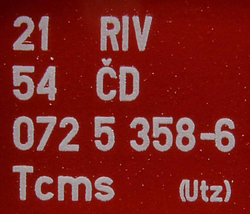 | • 21 54 072 5 358-6 | → | nákladní, nezávislé nápravy, pevný rozchod, ve vlastnictví železniční správy, RIV, PPV |