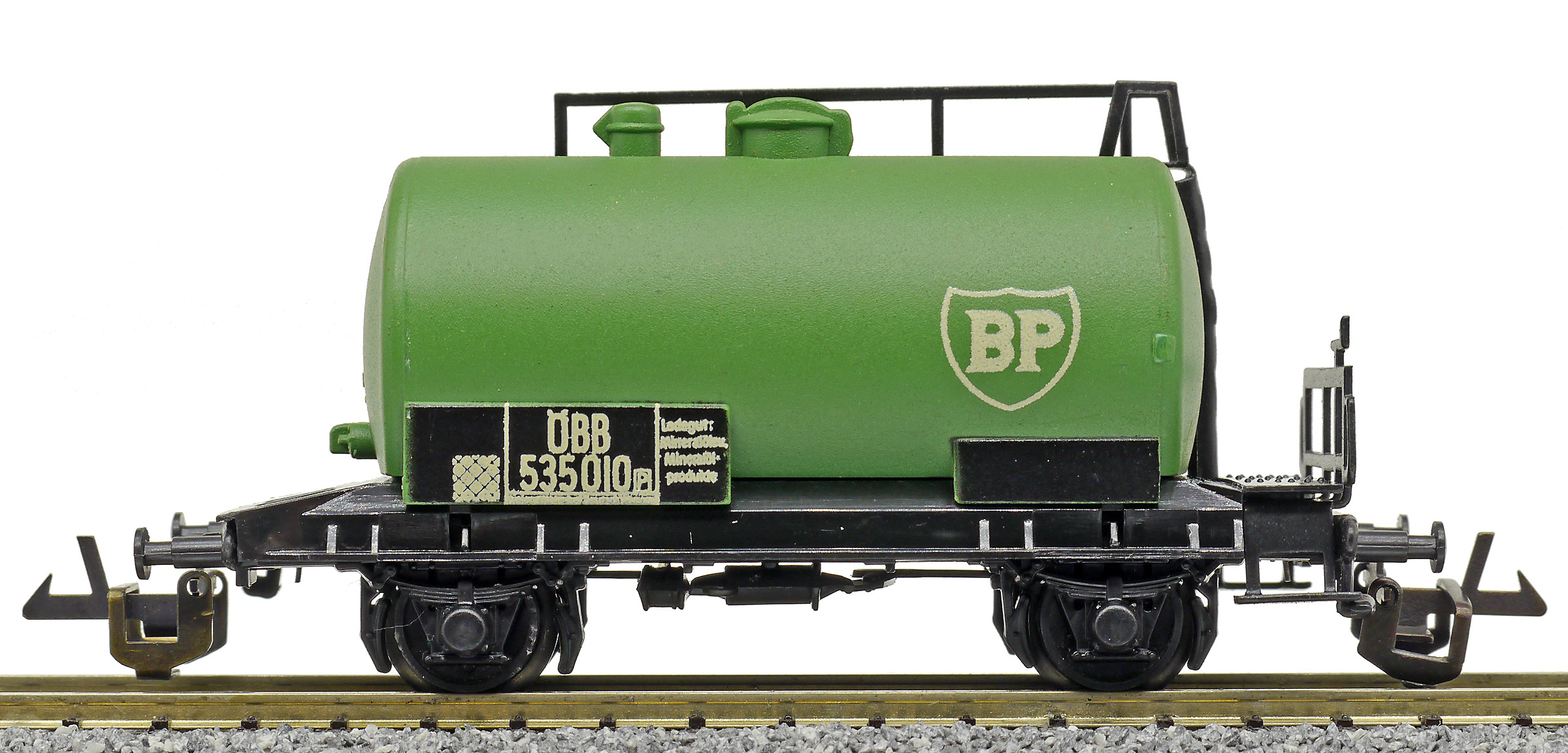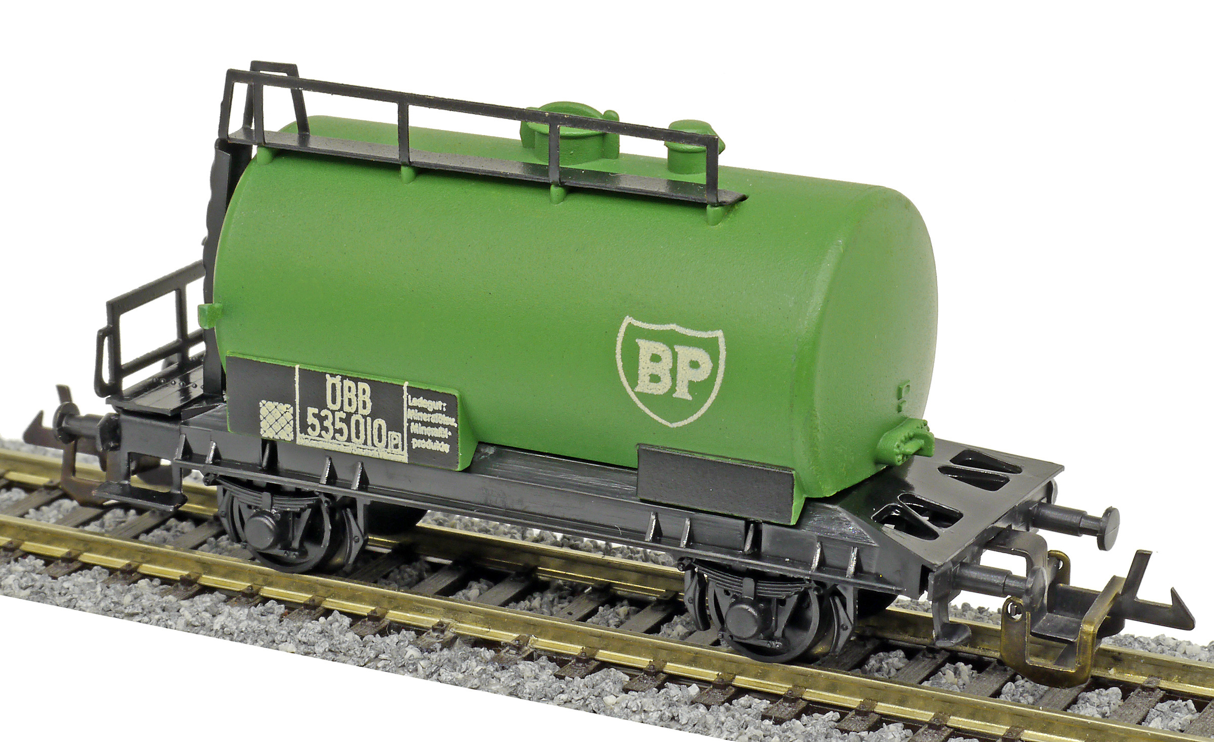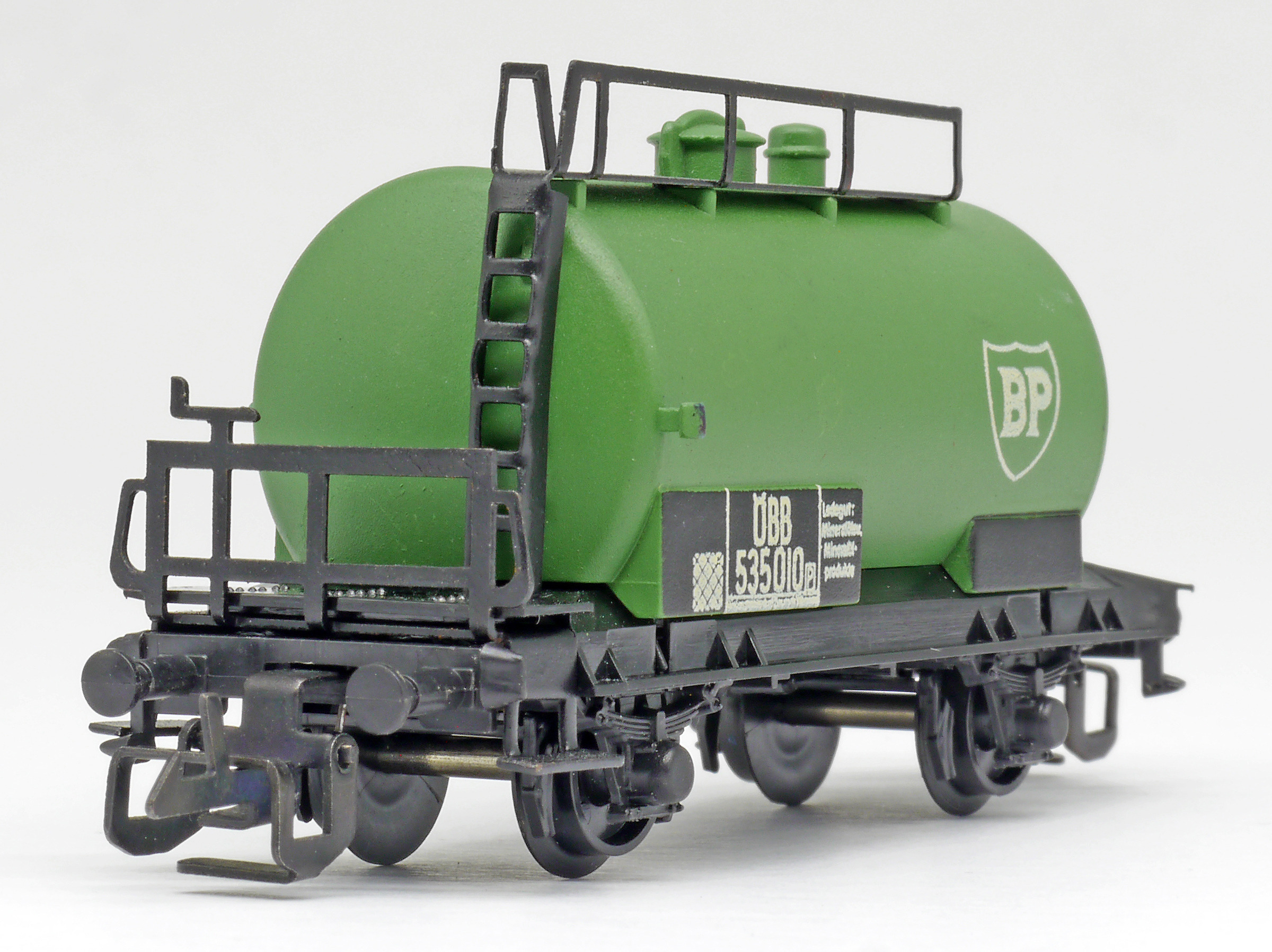 kotlový vůz zelený s černým pojezdem a s logem „BP“
