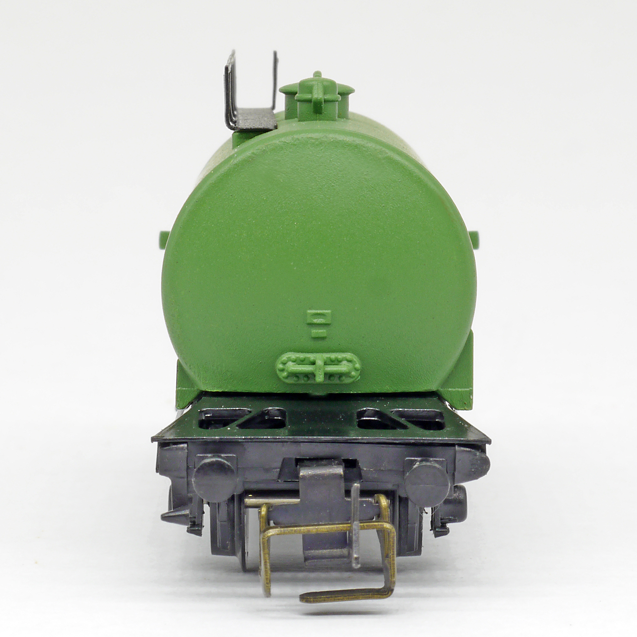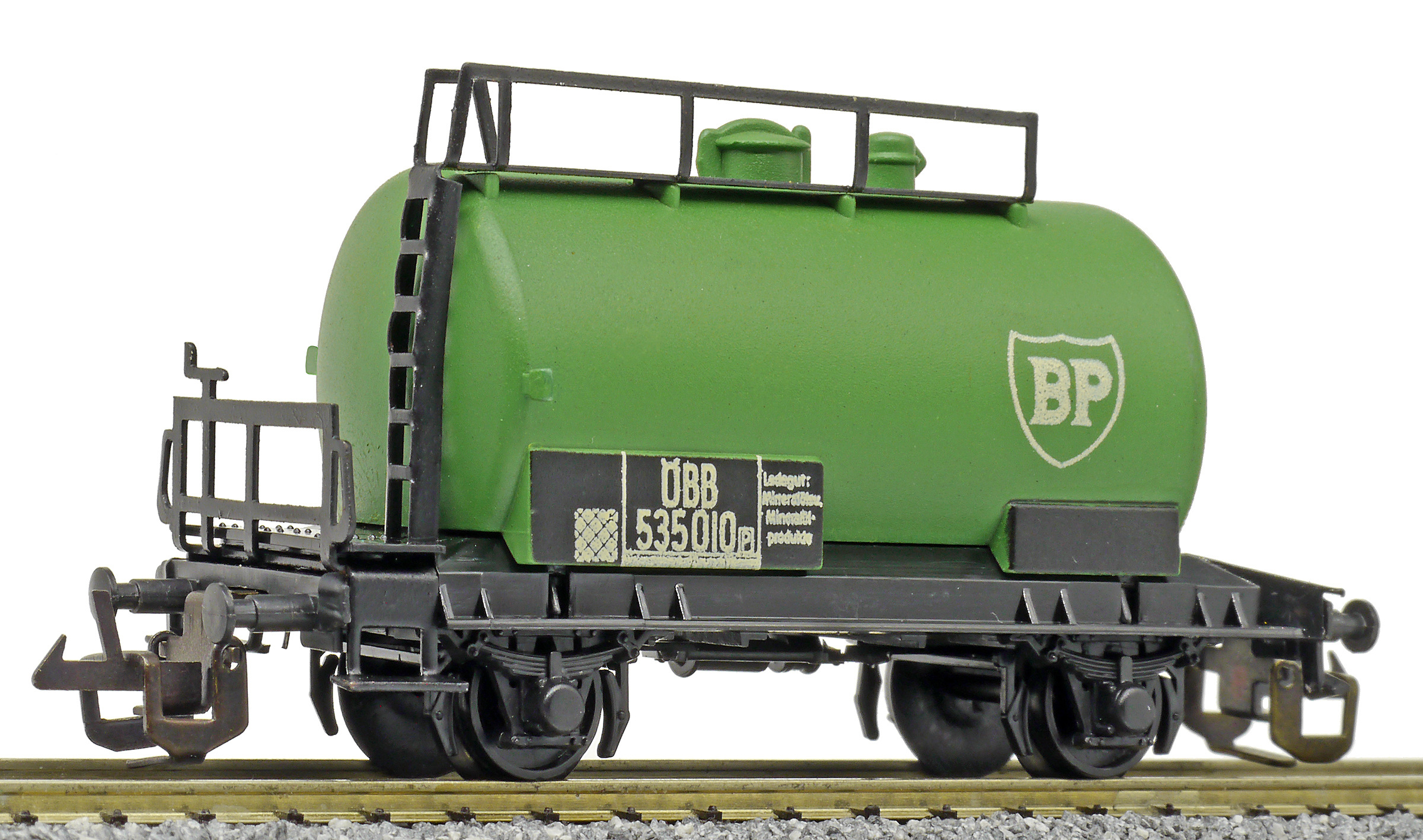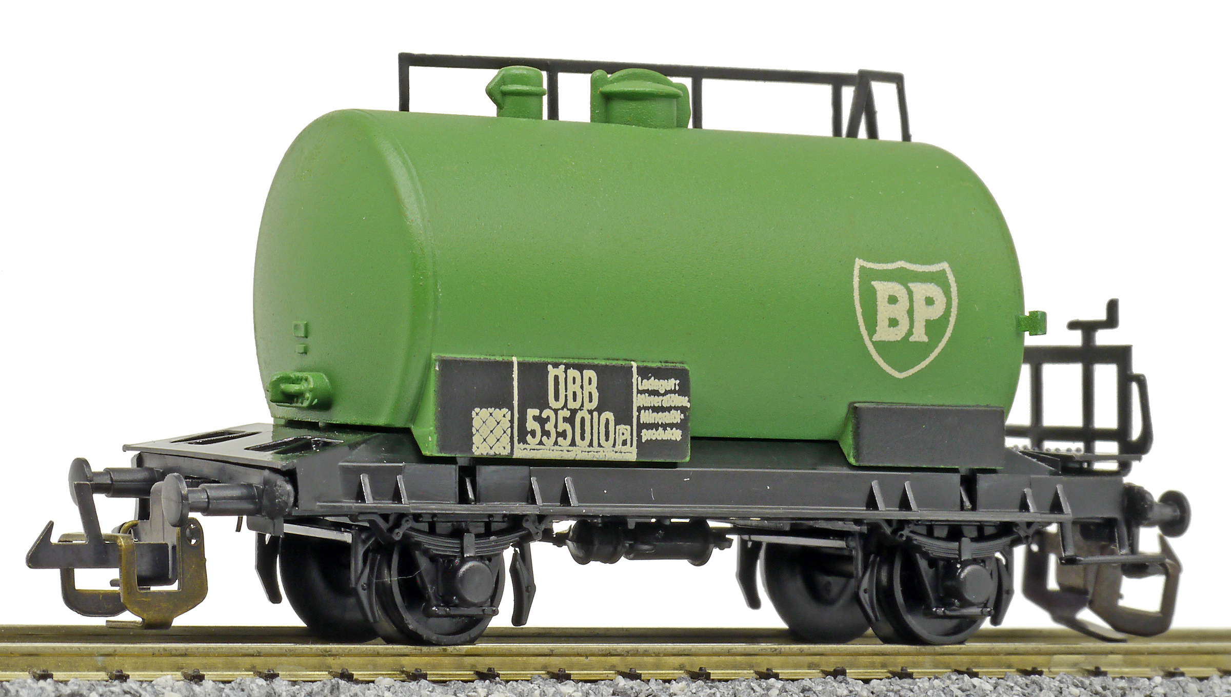 kotlový vůz zelený s černým pojezdem a s logem „BP“