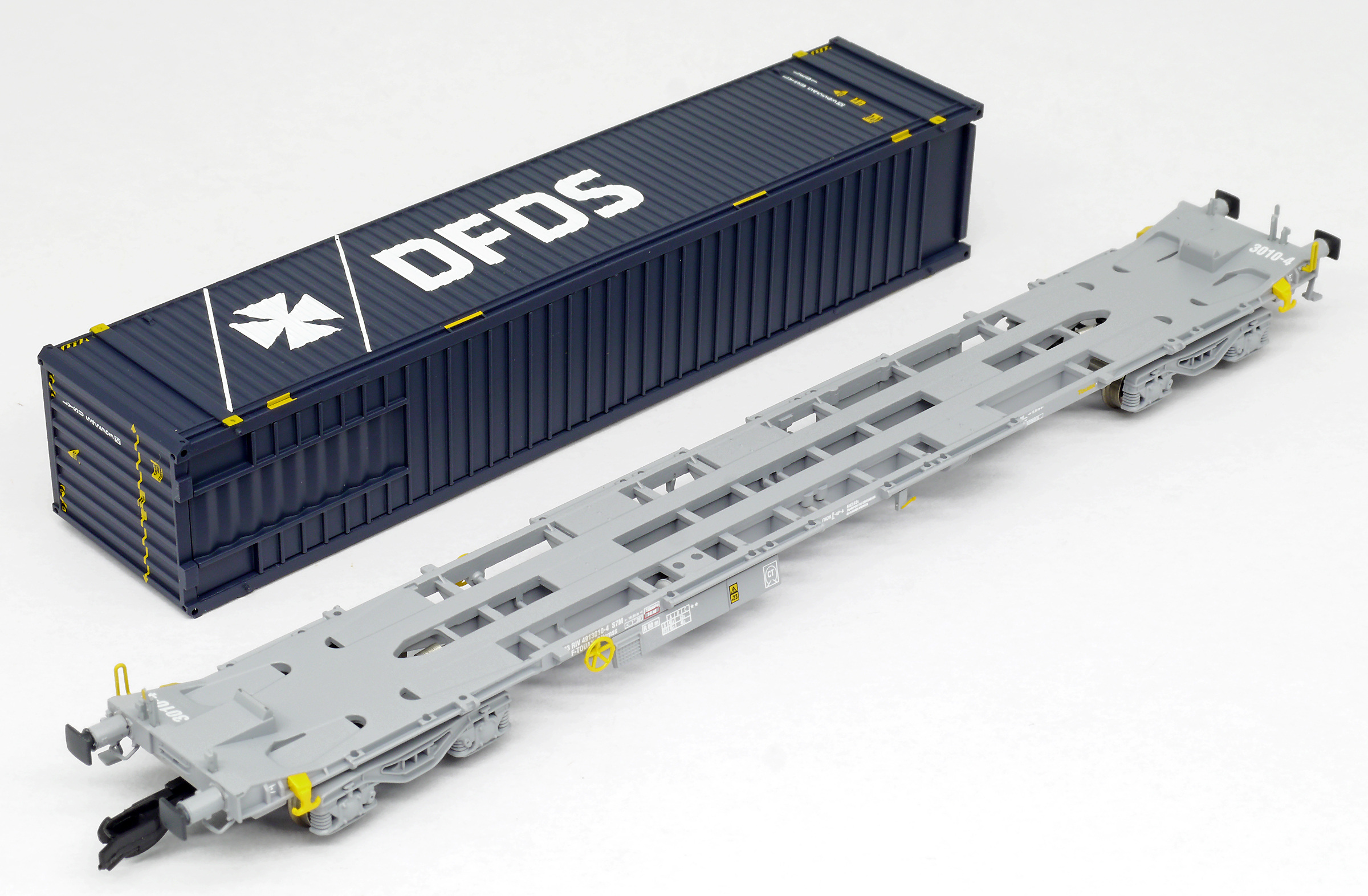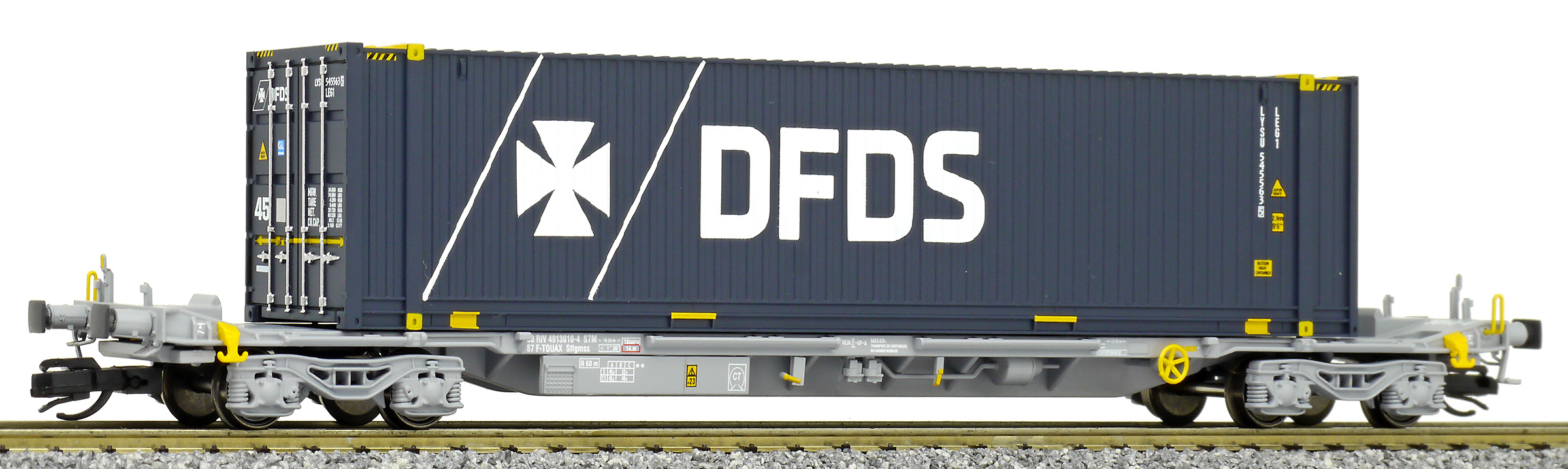 | kontejnerový vůz „IFA” šedý ložený 45' kontejnerem „DFDS” |