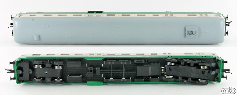 | motorový vůz zelený-slonová kost s šedou střechou, výstražný pruh na čelech |