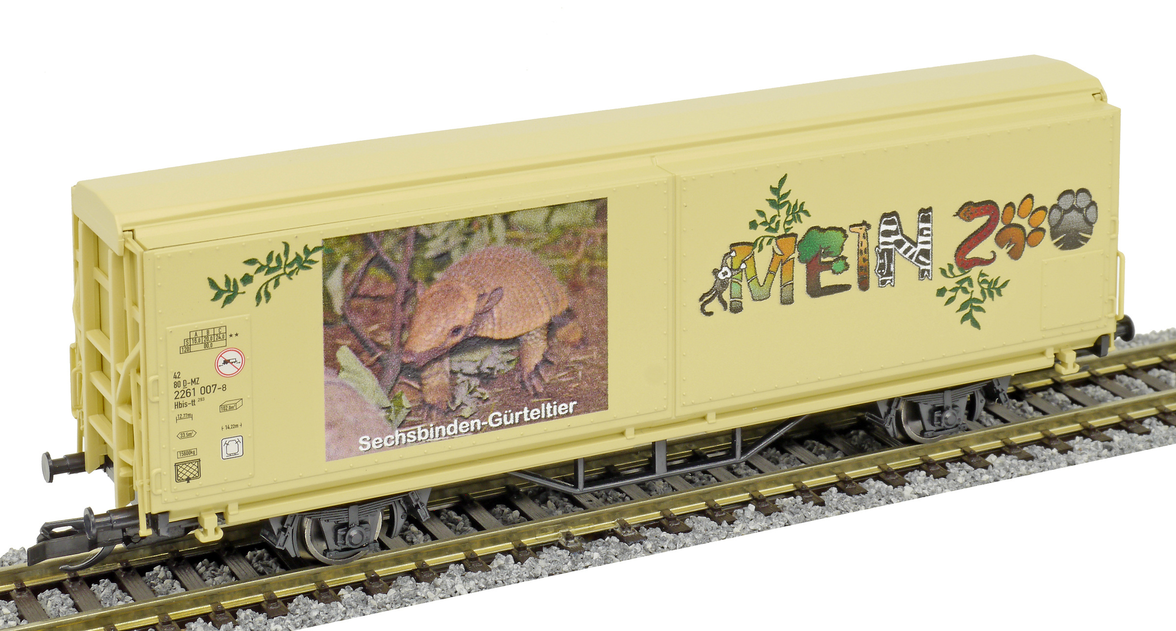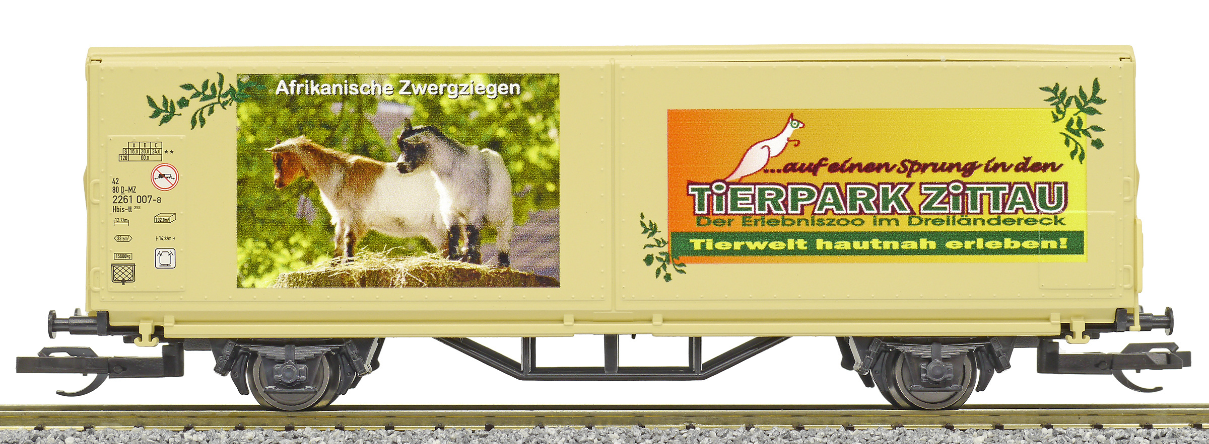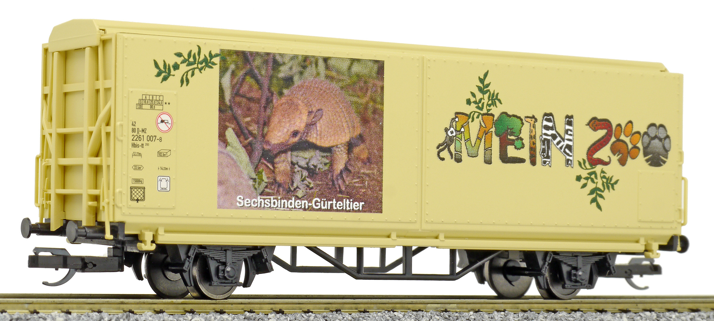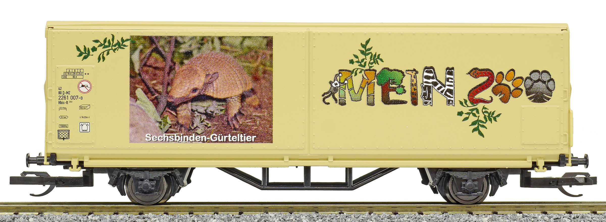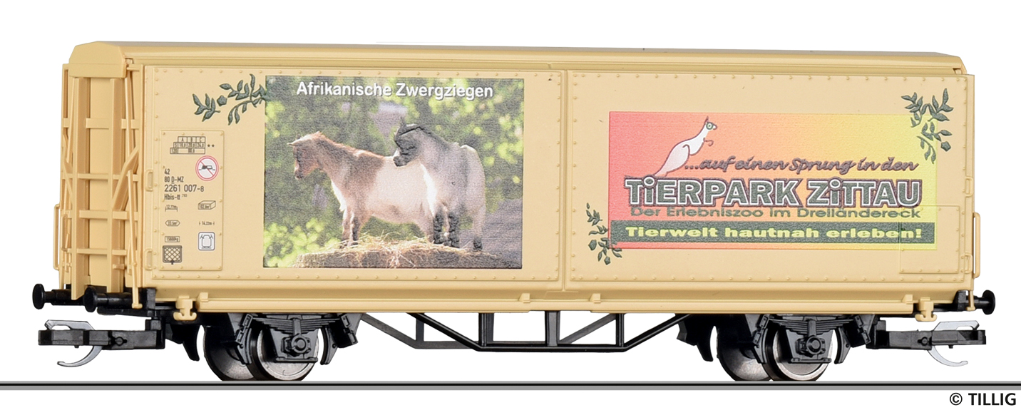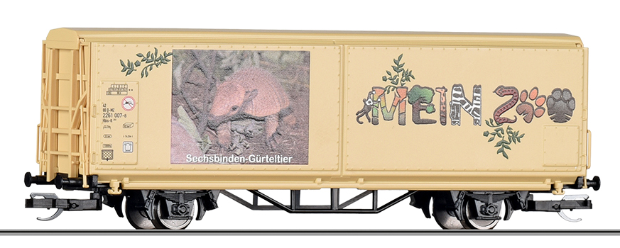 | krytý nákladní vůz s posuvnými stěnami a s reklamním potiskem „Mein Zoo” |