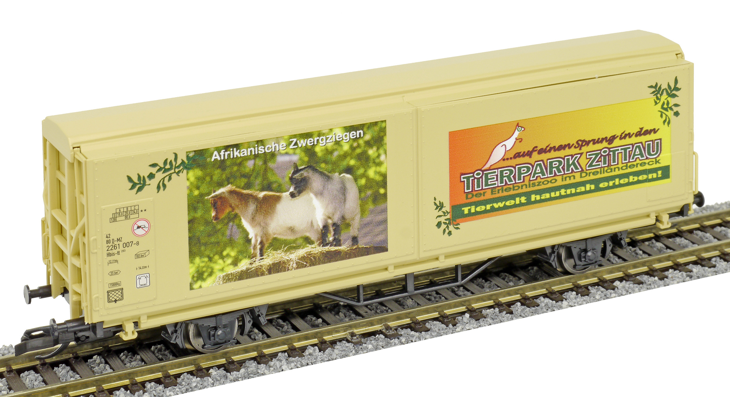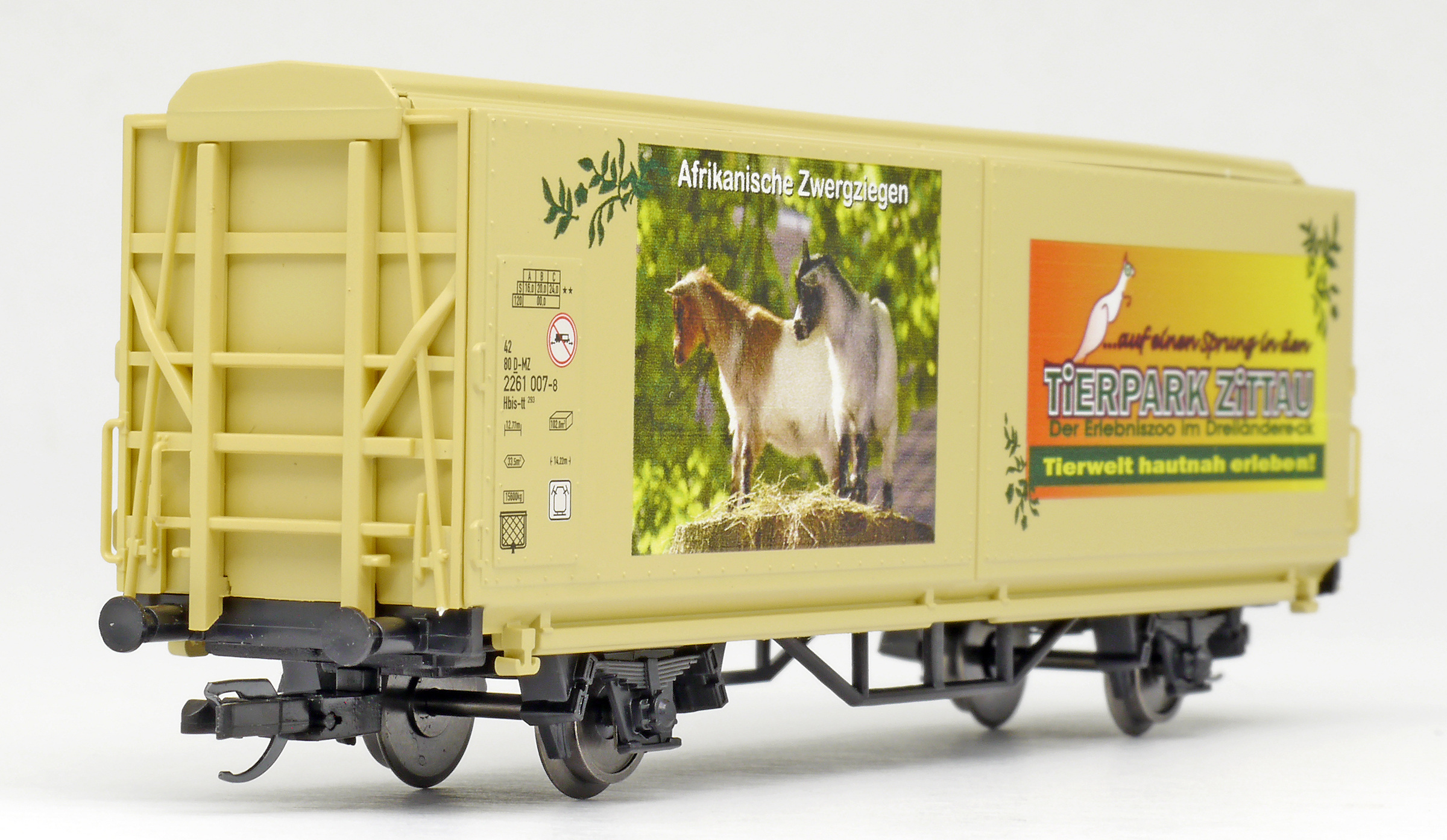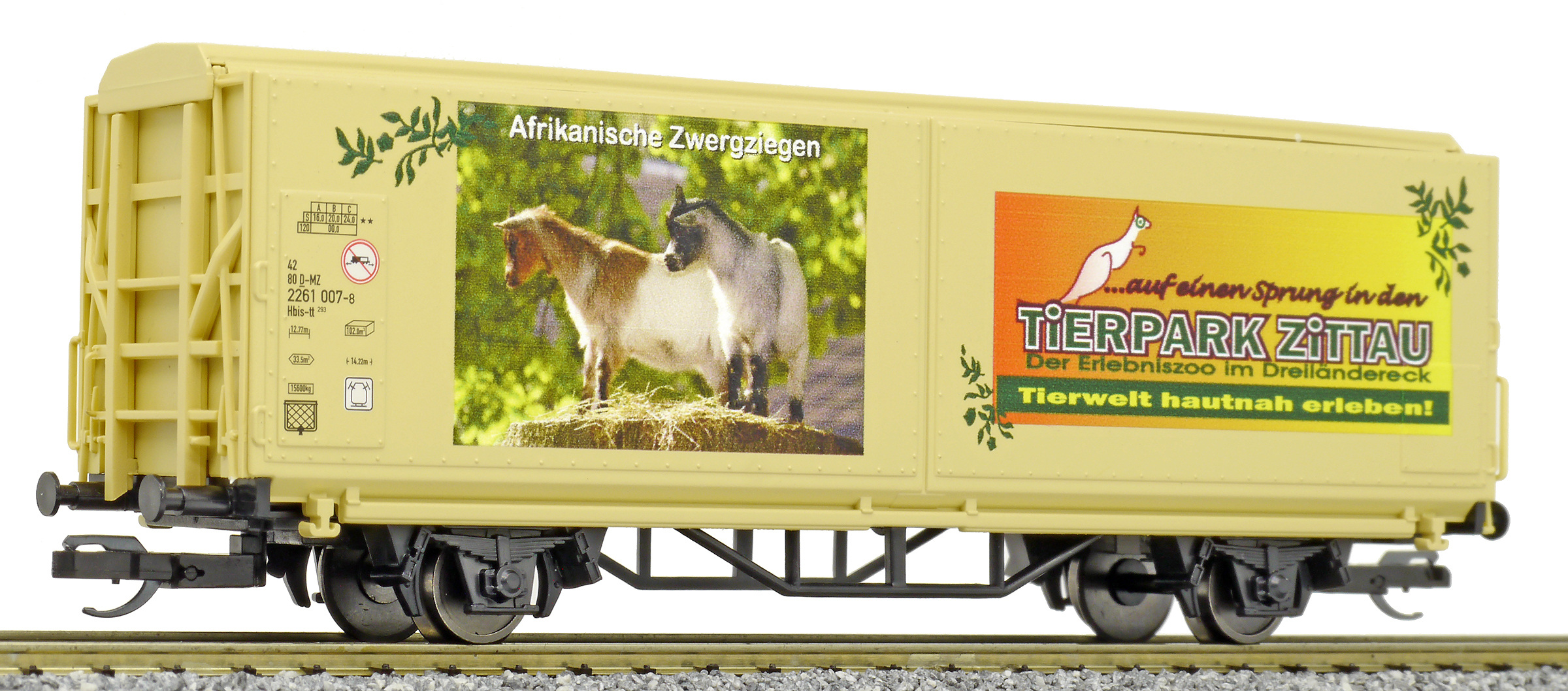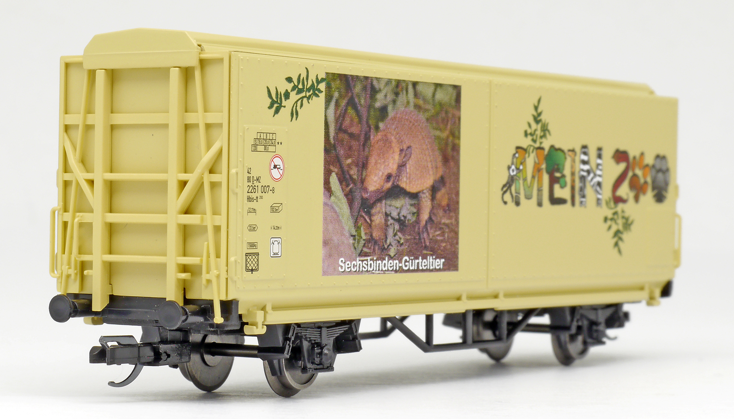 | krytý nákladní vůz s posuvnými stěnami a s reklamním potiskem „Mein Zoo” |