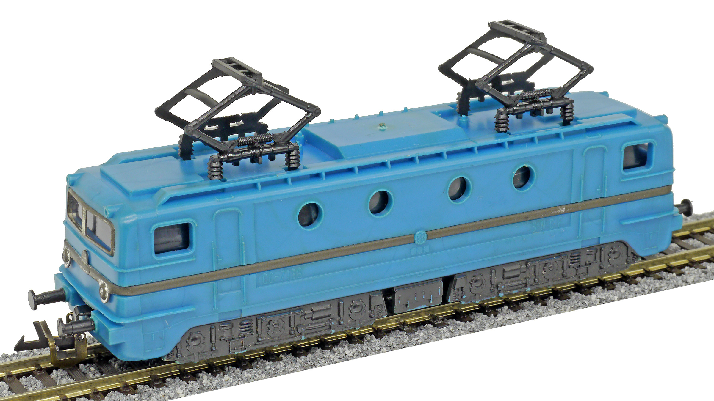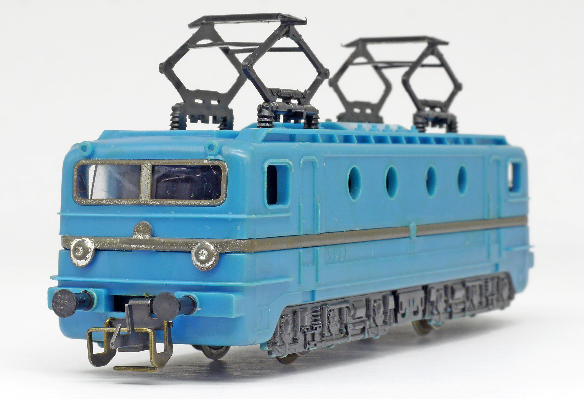 elektrická lokomotiva, různé barvy plastu, černé plastové pantografy a černá imitace pojezdu