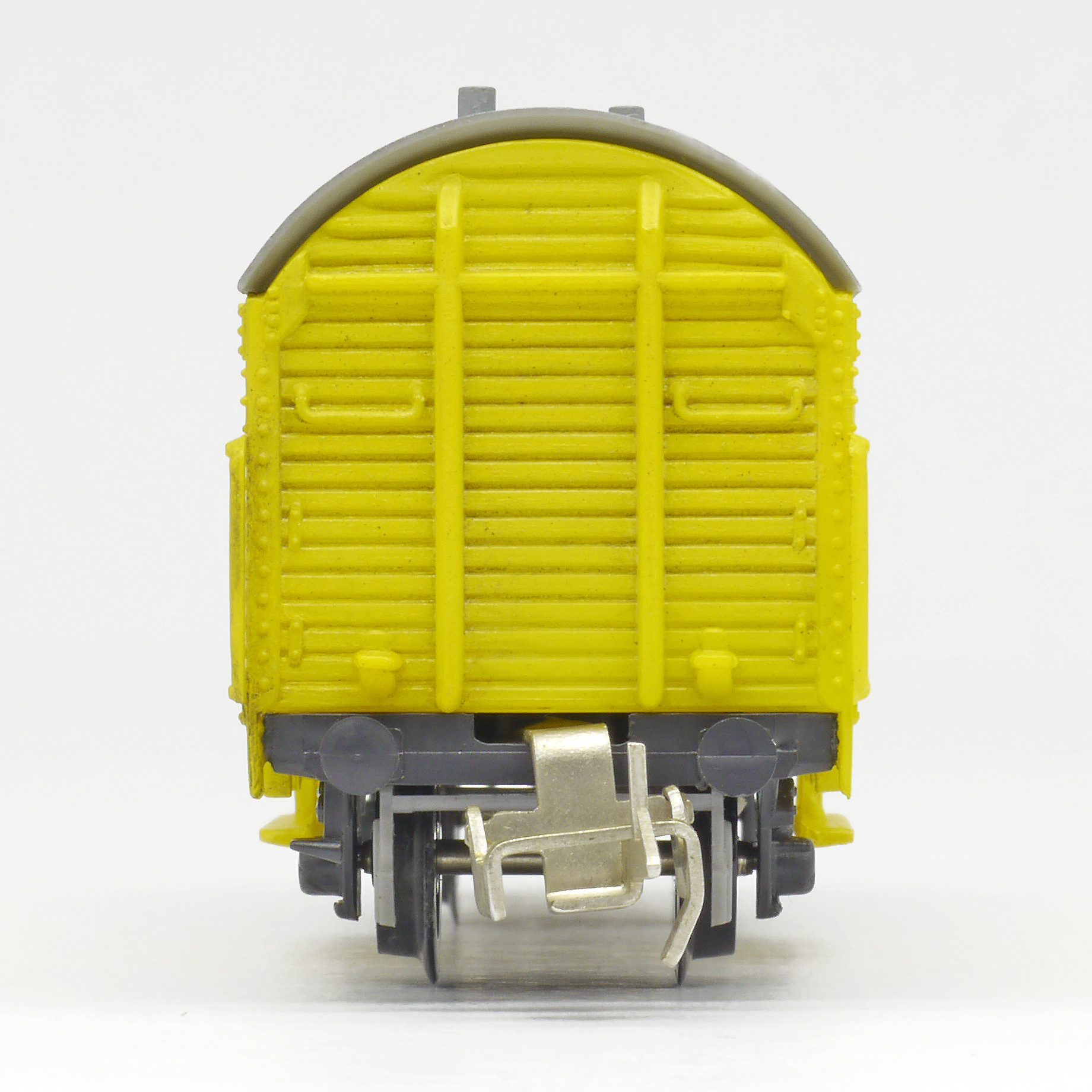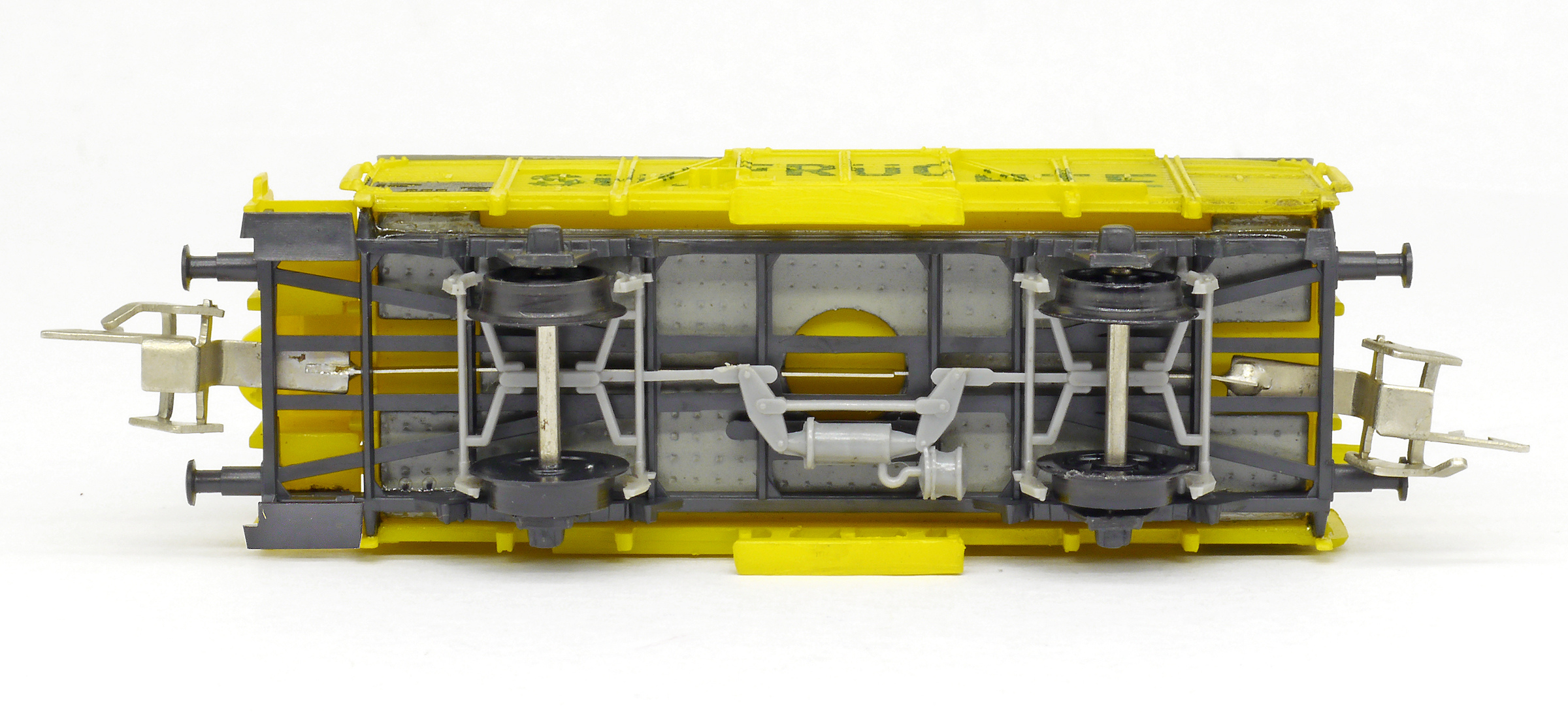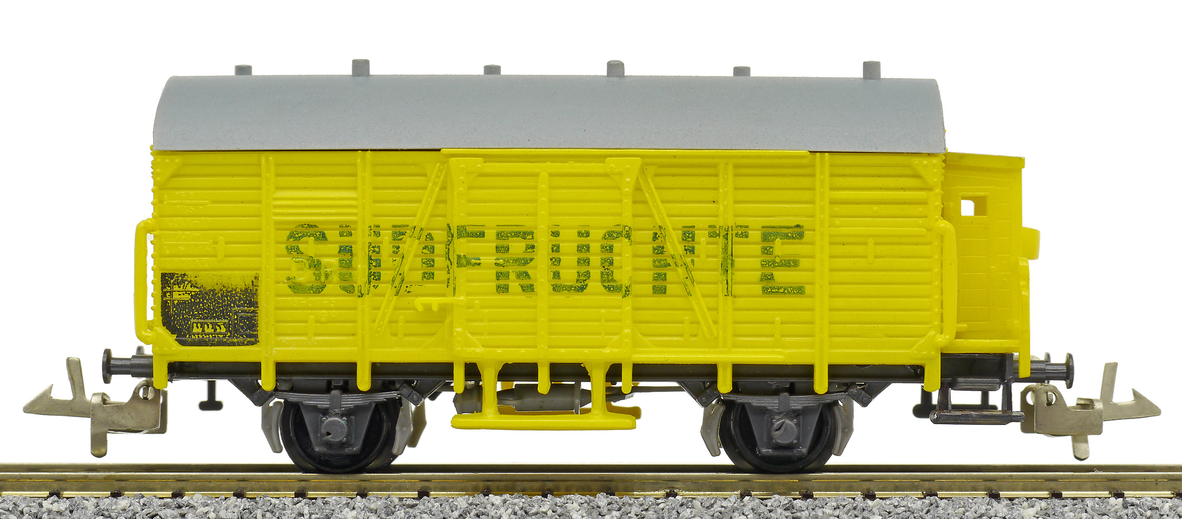 | nákladní chladící vůz žlutý s šedou střechou a s brzdařskou „Südfrüchte“ |