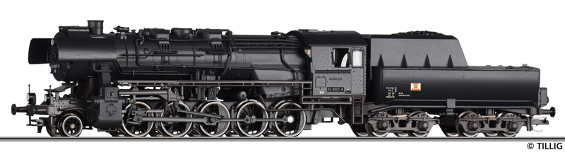 | parní lokomotiva černá s kouřovými plechy, s provozní černohnědou patinou |
