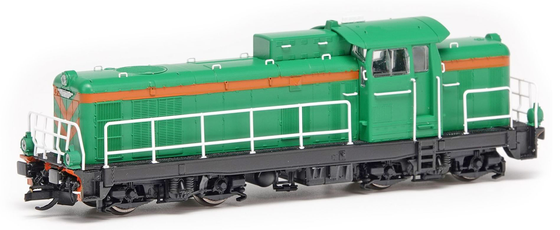 | dieselová lokomotiva zelená-oranžová, černý rám a pojezd |